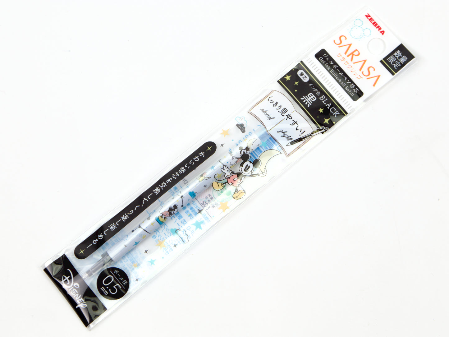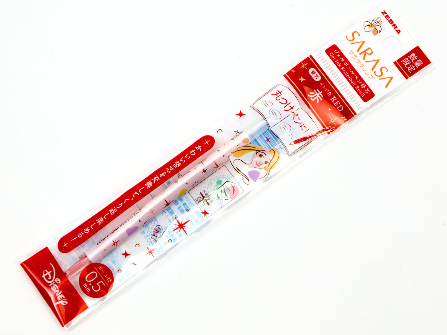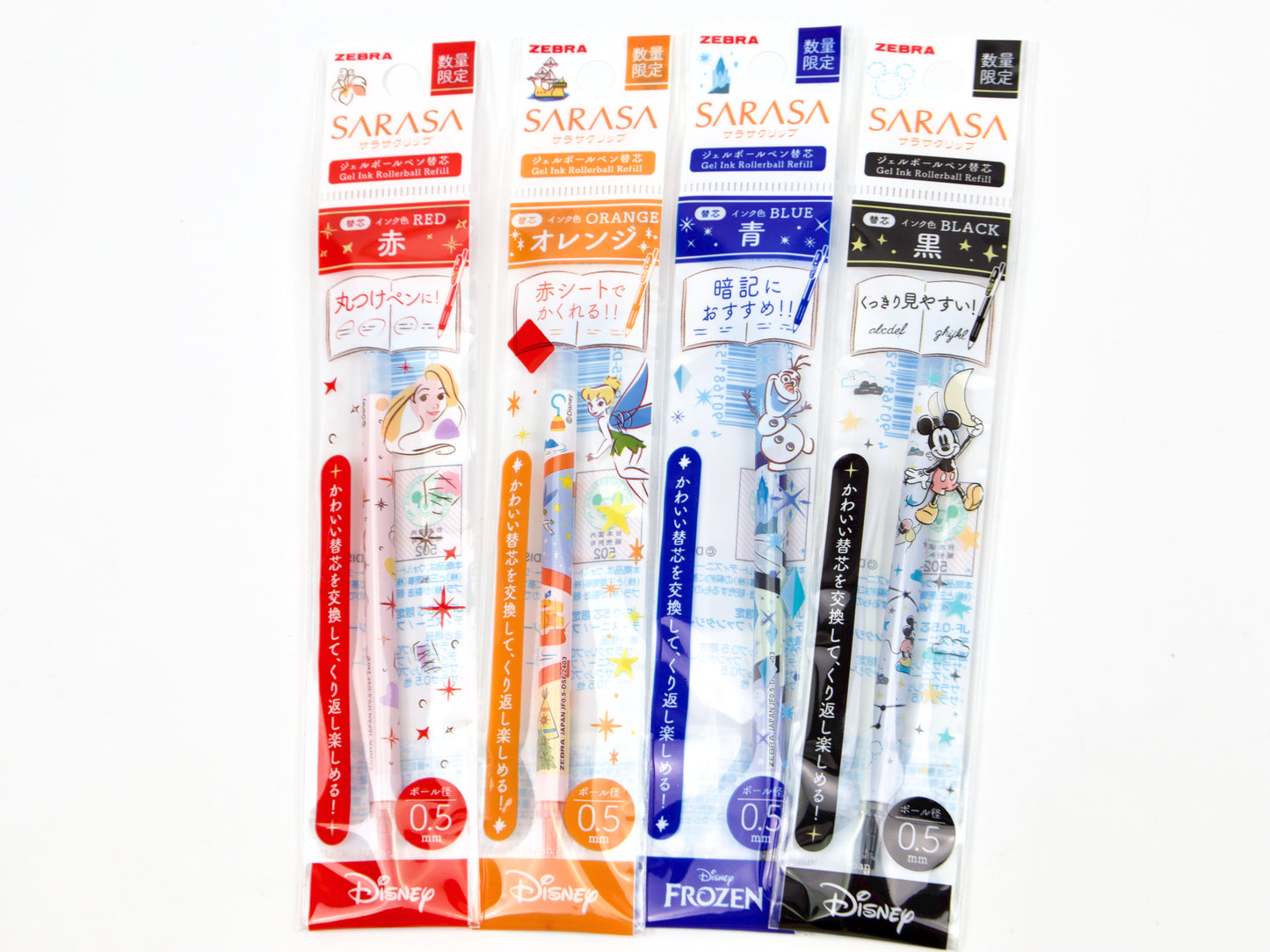 Recambios de edición limitada de Disney con diseño de Sarasa Clip en tinta de gel de 0,5 mm. Elige entre Mickey Mouse Black, Frozen Blue, Rapunzel Red y Peter Pan Orange. Especialmente diseñados para la edición limitada de Disney Sarasa Clip , pero pueden adaptarse a cualquier barril de Sarasa Clip y el diseño se verá aún más llamativo.