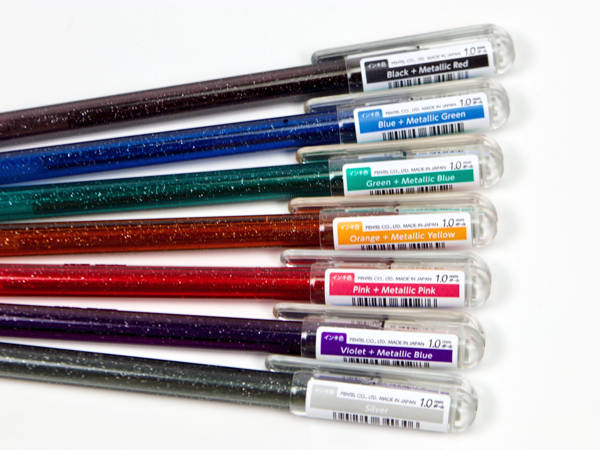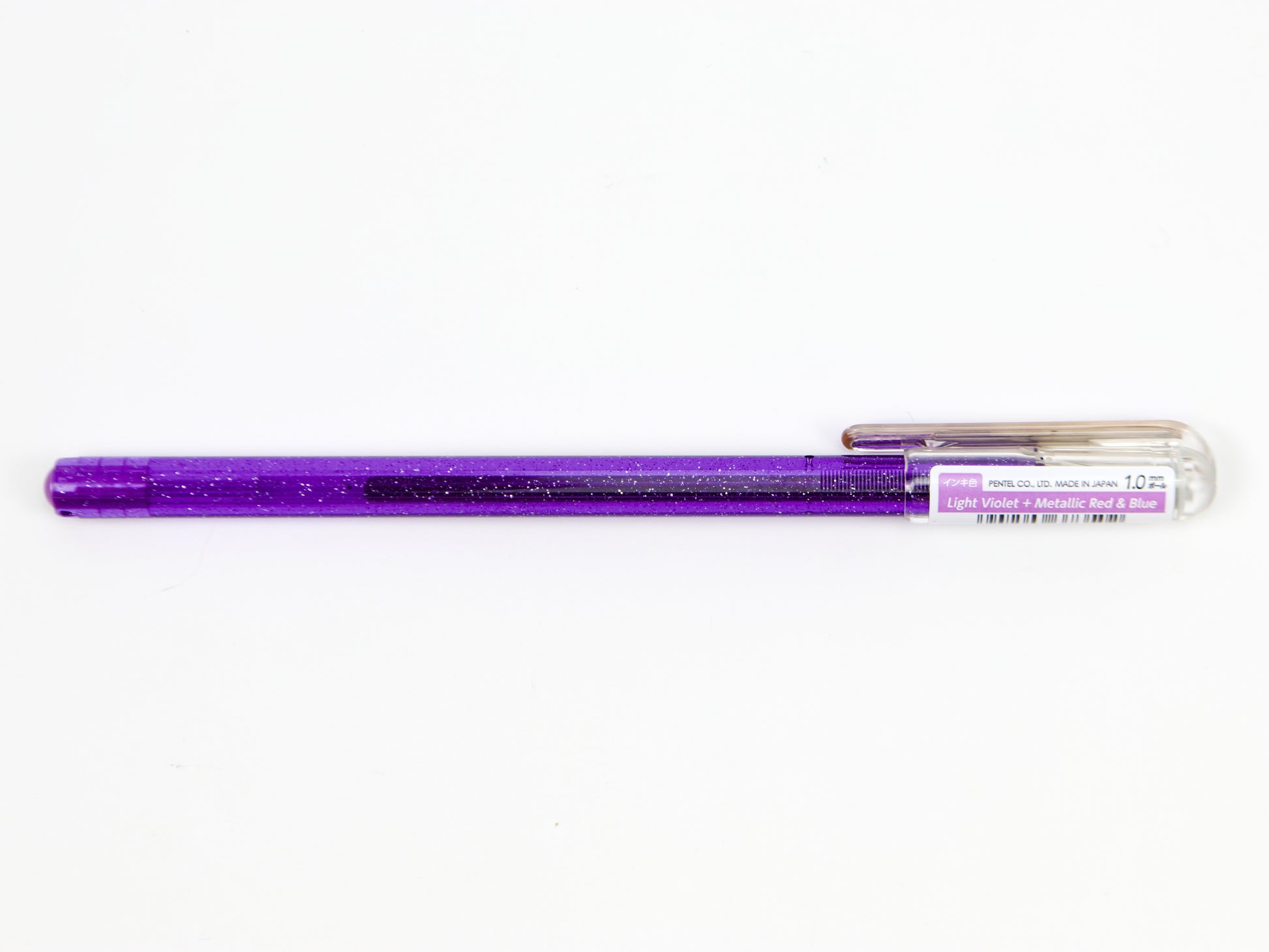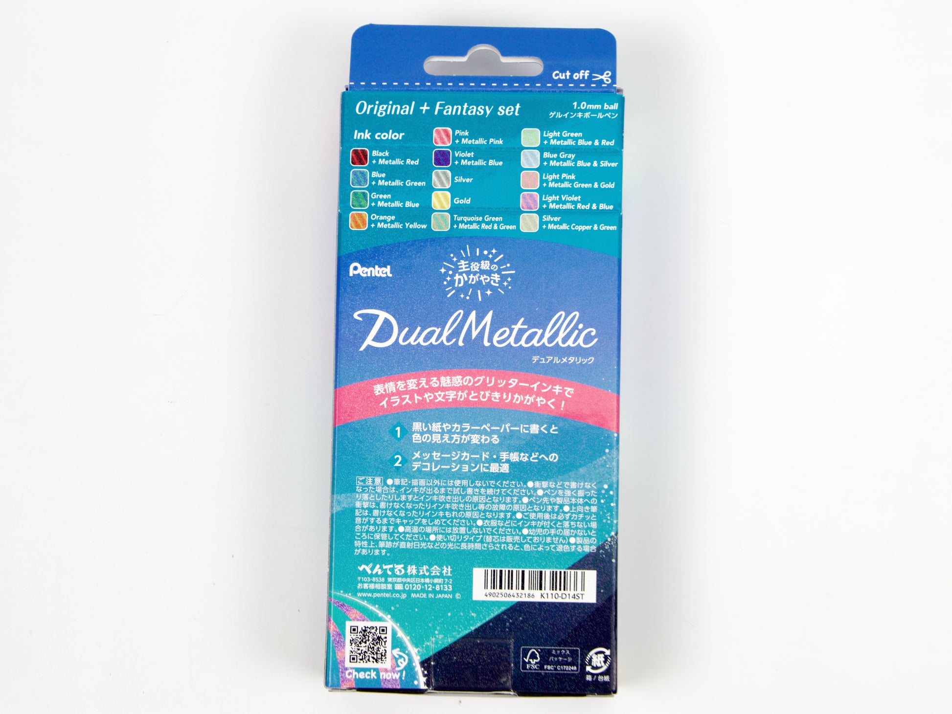 El Pentel Hybrid Dual Metallic es un bolígrafo de tinta pigmentada lamé de dos colores metálicos brillantes con una punta de bola de 1,0 mm. Para el lanzamiento limitado de otoño de 2020, ¡han agregado 7 nuevos colores metálicos duales! Las combinaciones de colores de esta línea son impresionantes y lucen geniales tanto en papel blanco como negro. El juego de 7 colores incluye: verde océano, verde aurora, gris hielo, rosa flor, violeta crepúsculo, dorado atardecer y plateado luna. ¡Este producto solo está disponible por tiempo limitado!