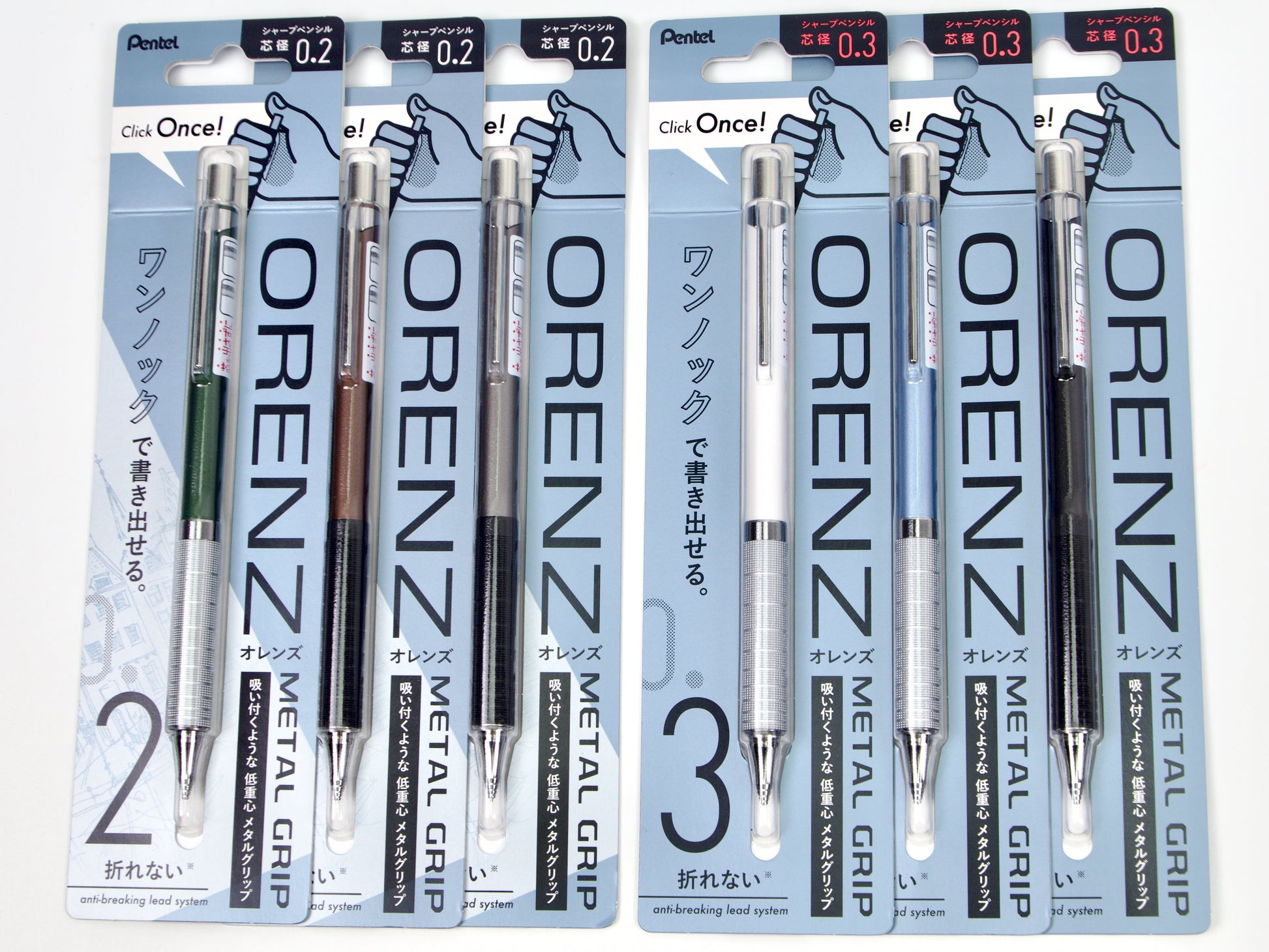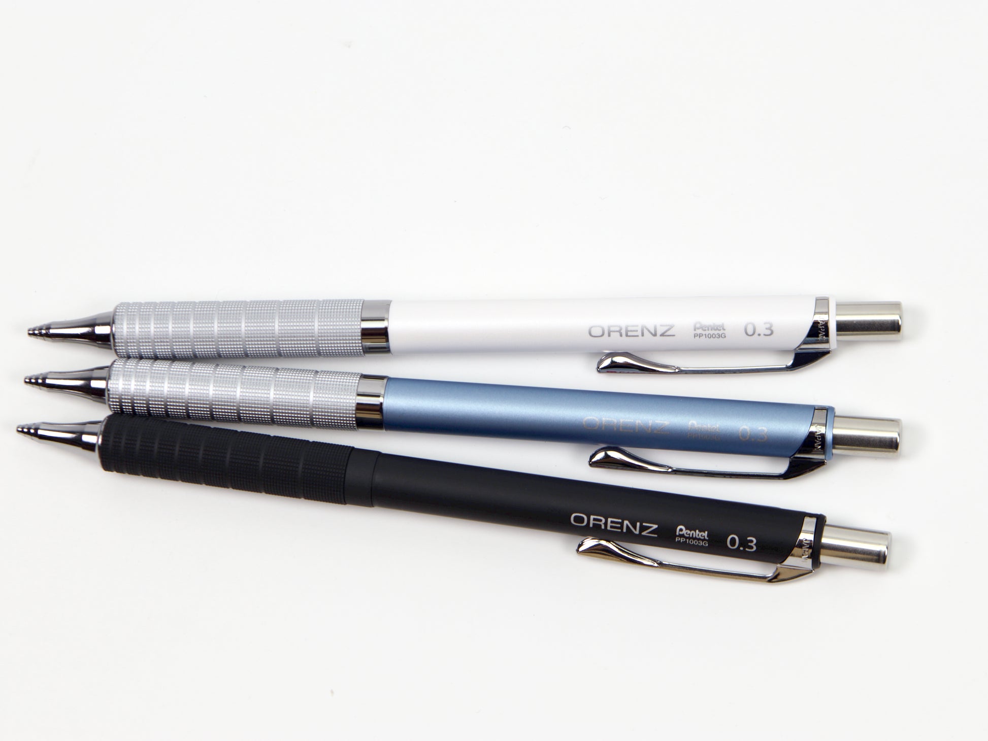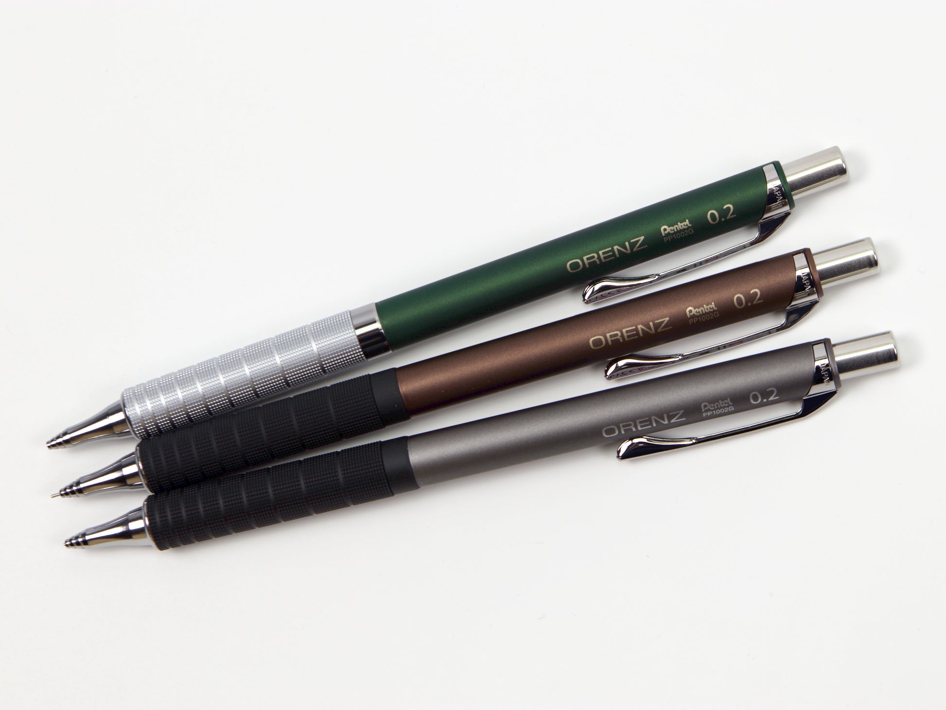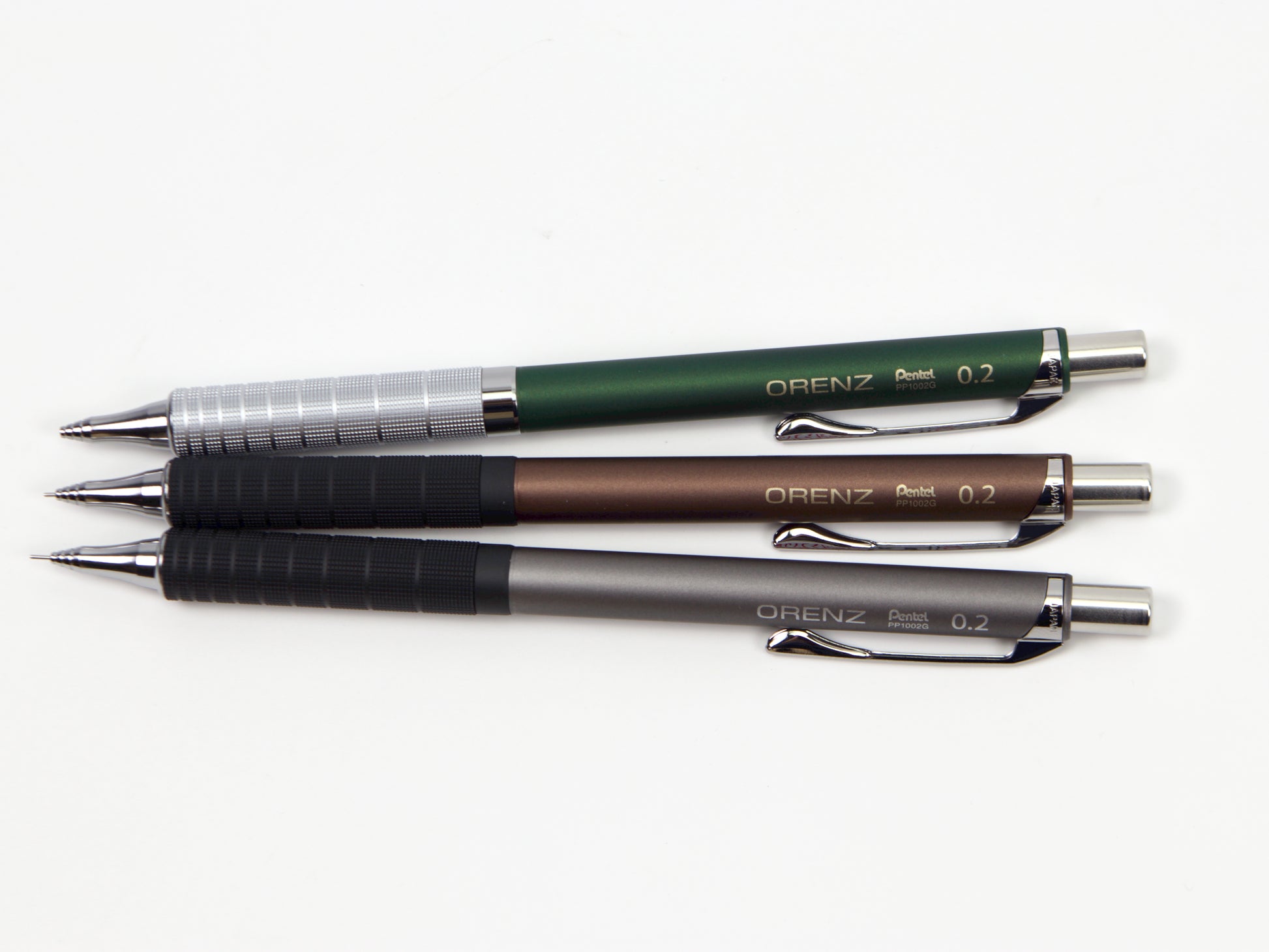 El Pentel Orenz cuenta con una innovadora punta en forma de tubo que protege la mina mientras escribes. Comienzas a escribir sin que la mina sobresalga y el lápiz la introduce según sea necesario. Esto protege la mina superfina de roturas y te permite escribir con una mina más fina de lo que normalmente podrías. El Pentel Orenz Metal Grip está disponible en tamaños de punta de 0,2 mm y 0,3 mm. Recambios de borrador disponibles. Este lápiz también está disponible en 0,5 mm .