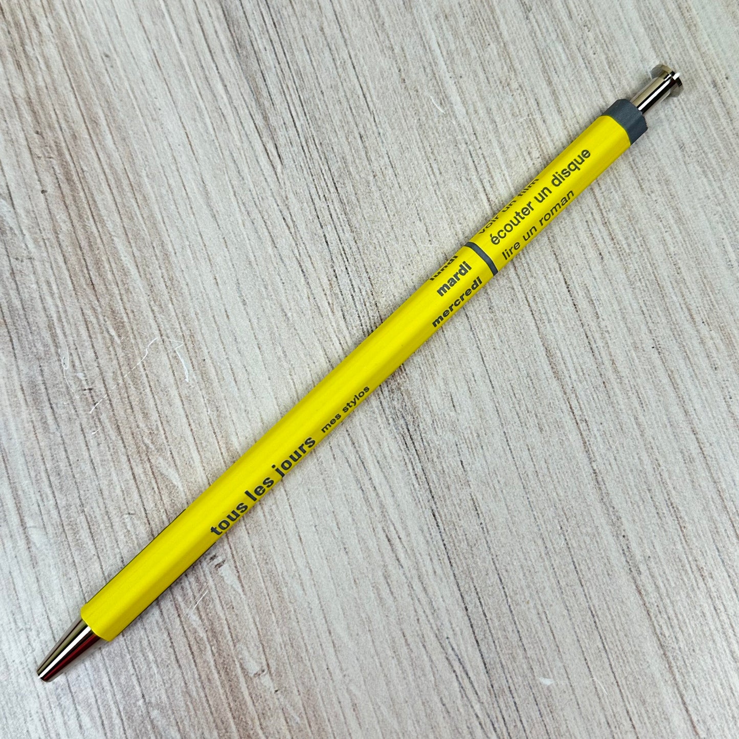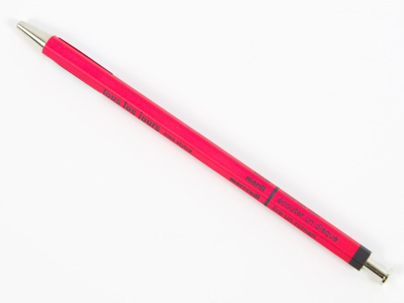 Le stylo à bille Tous Les Jours de Mark's Inc. est doté d'une tige élégante rappelant un crayon en bois ordinaire, avec la fonctionnalité d'un stylo à bille. Le stylo peut contenir une recharge Ohto noire de 0,5 mm 175NP et est rechargeable . Ce stylo a une pointe effilée.