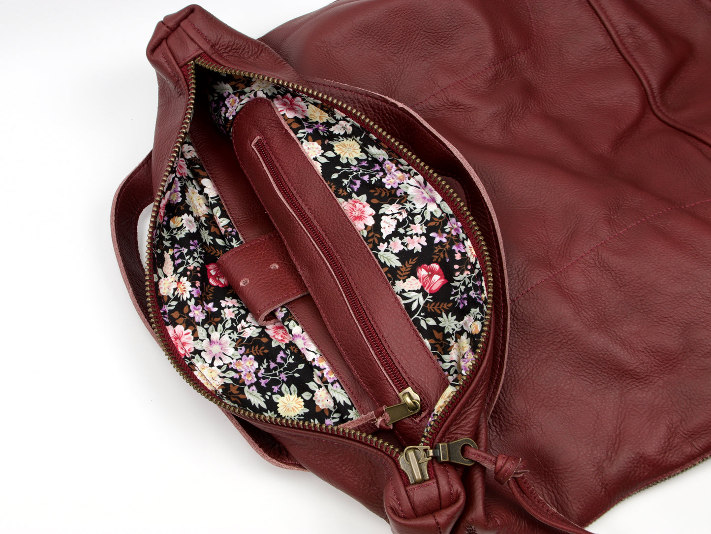 - Cuir de vachette souple bordeaux, doublure en coton à motifs floraux assortis (le stock actuel contient le motif floral sur fond noir), fermetures à glissière extérieures YKK