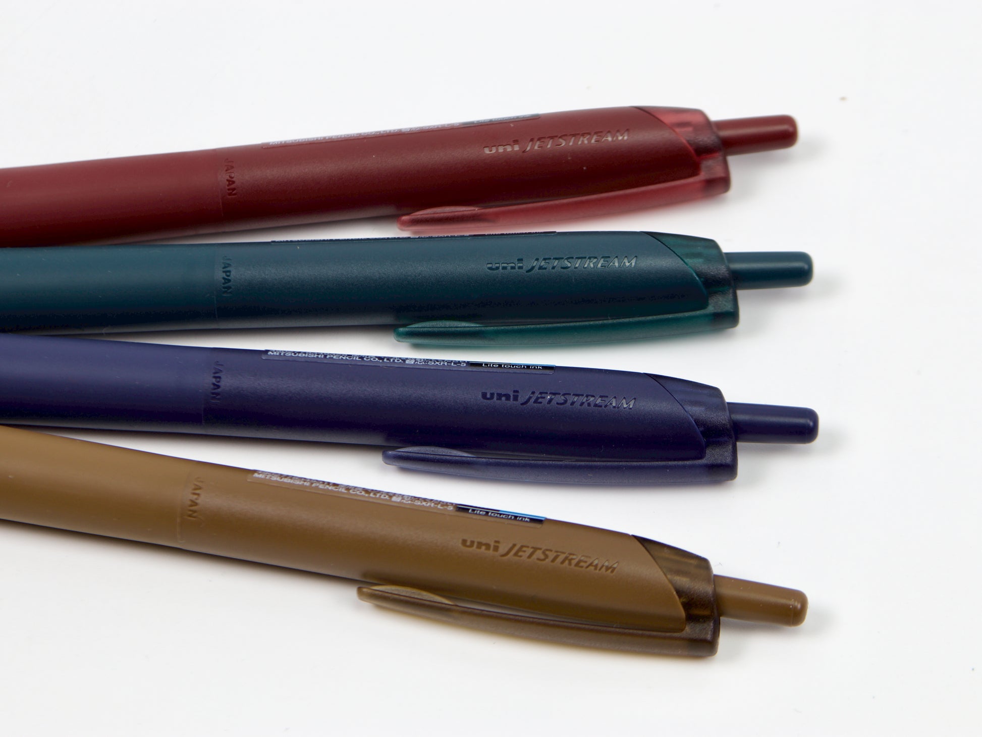 The Jetstream Lite Touch features a new ink formulation that is even smoother than the original Jetstream ink! Extra attention has also gone into the design of the pen barrel. The knock portion has a mechanism that suppresses minute vibrations and noise when writing. The barrel's rubber coating goes all the way to the tip of the nose for a smooth feel and simple appearance. The barrel coloring gives a sense of lightness while blending in to daily life. The clip is difficult to break and has a shape that is compatible with your notebook or pocket.