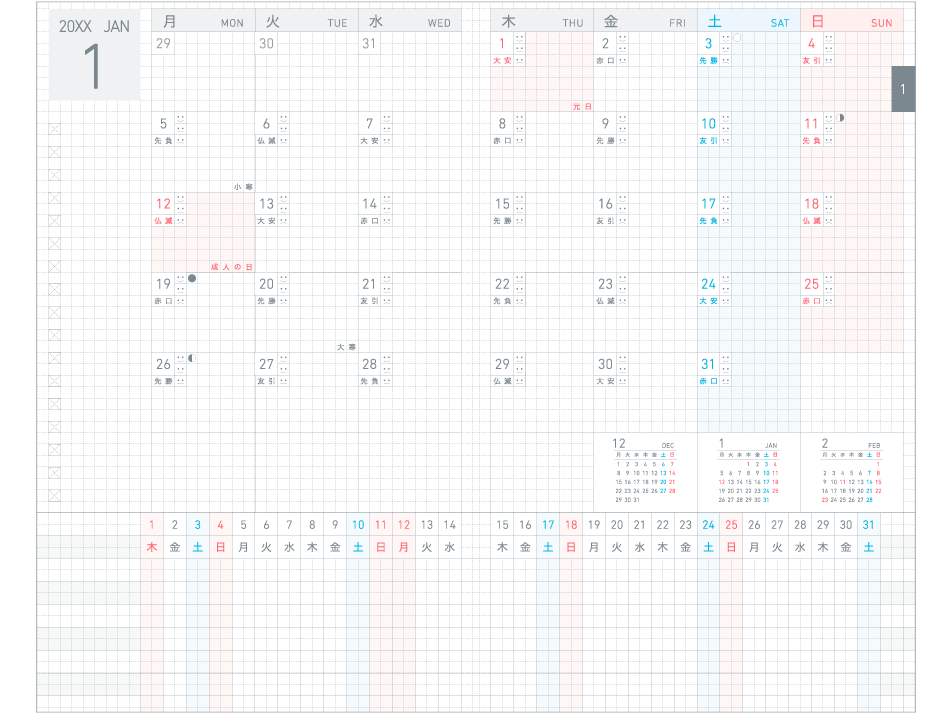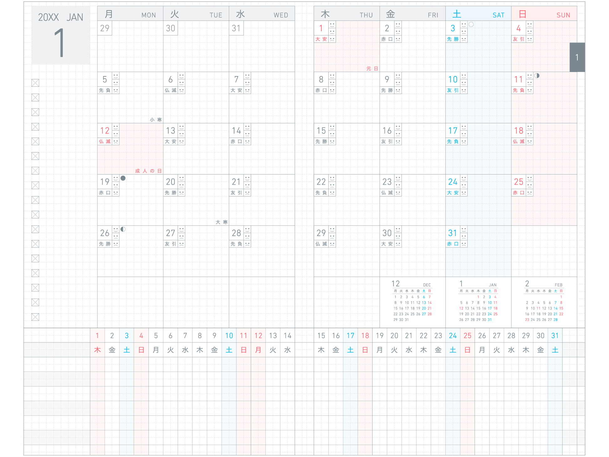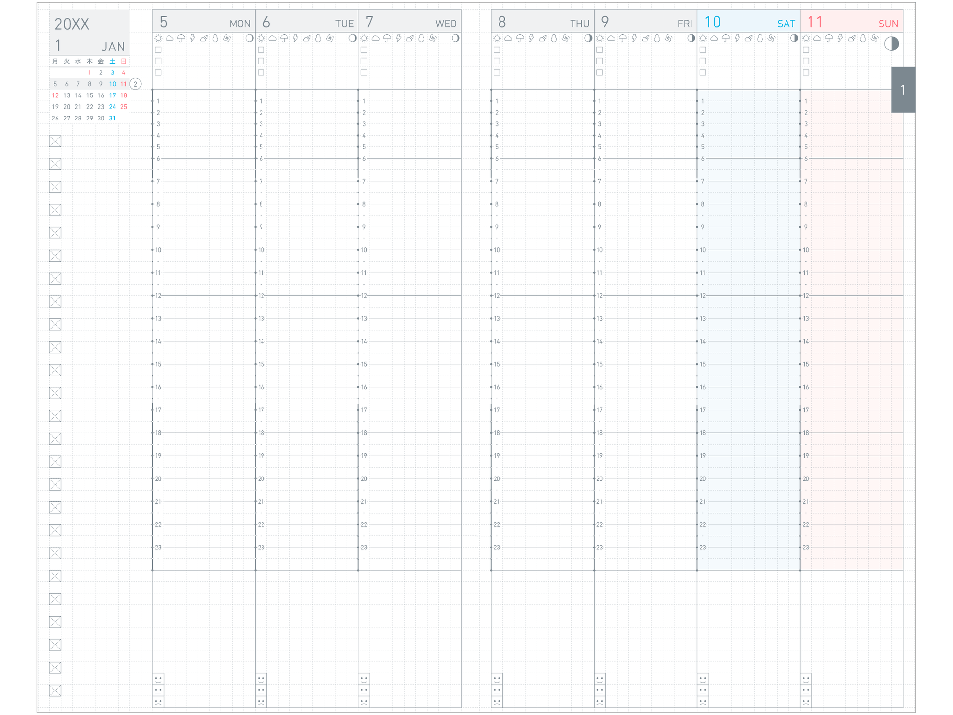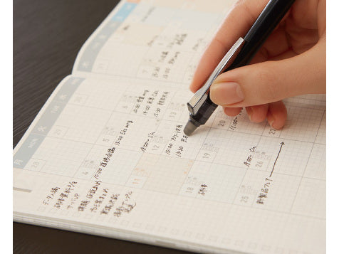 The Jibun Techo Lite Mini provides a monthly plus vertical 24-hour weekly calendar layout along with some trimmed down features to help you plan your business or personal life. The Jibun Techo uses a proprietary 'thin paper', which is formulated to help prevent bleed-through and to pair well with tougher erasable pens (paper is not as likely to wrinkle when erasing).