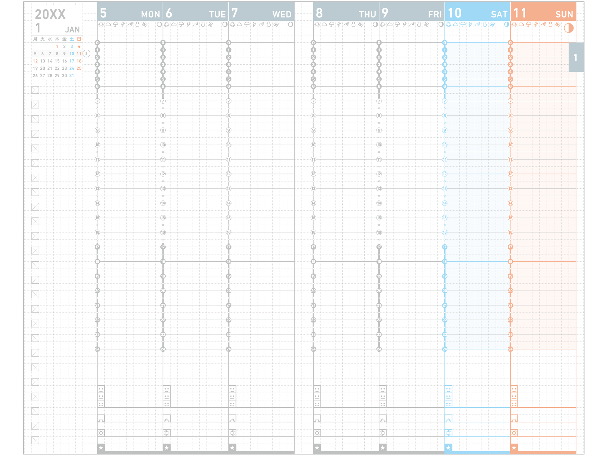 The Jibun Techo Mini provides a monthly plus vertical 24-hour weekly calendar layout along with many other features to help you plan your business or personal life. The Jibun Techo uses a brand new proprietary 'thin paper', which is formulated to help prevent bleed-through and to pair well with tougher erasable pens (paper is not as likely to wrinkle when erasing).