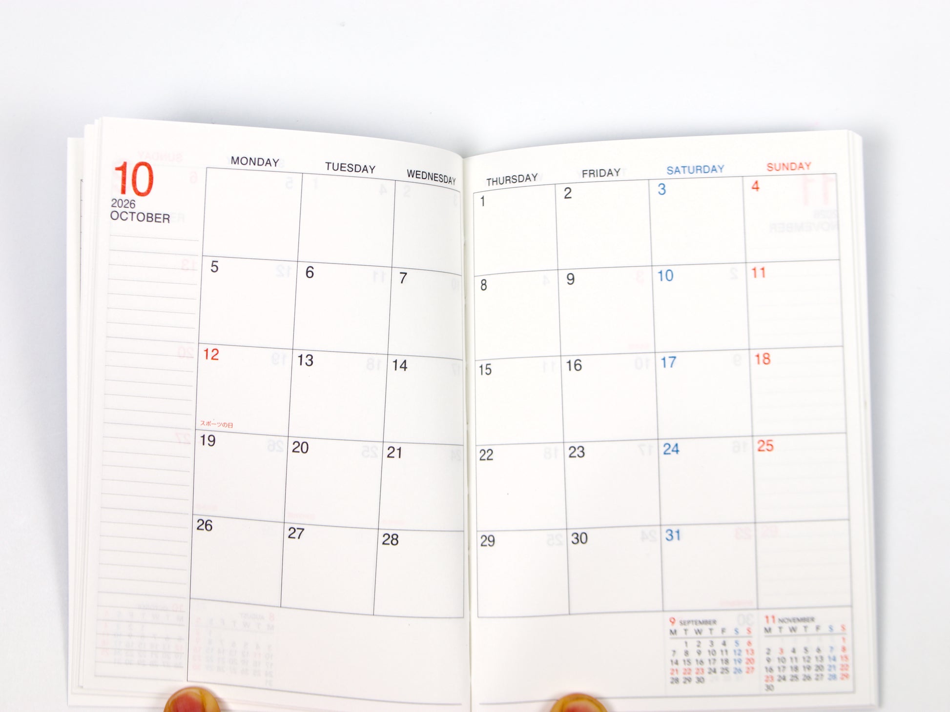 - 14 Monthly spreads, Yearly Schedule (on two pages), and 32 lined pages