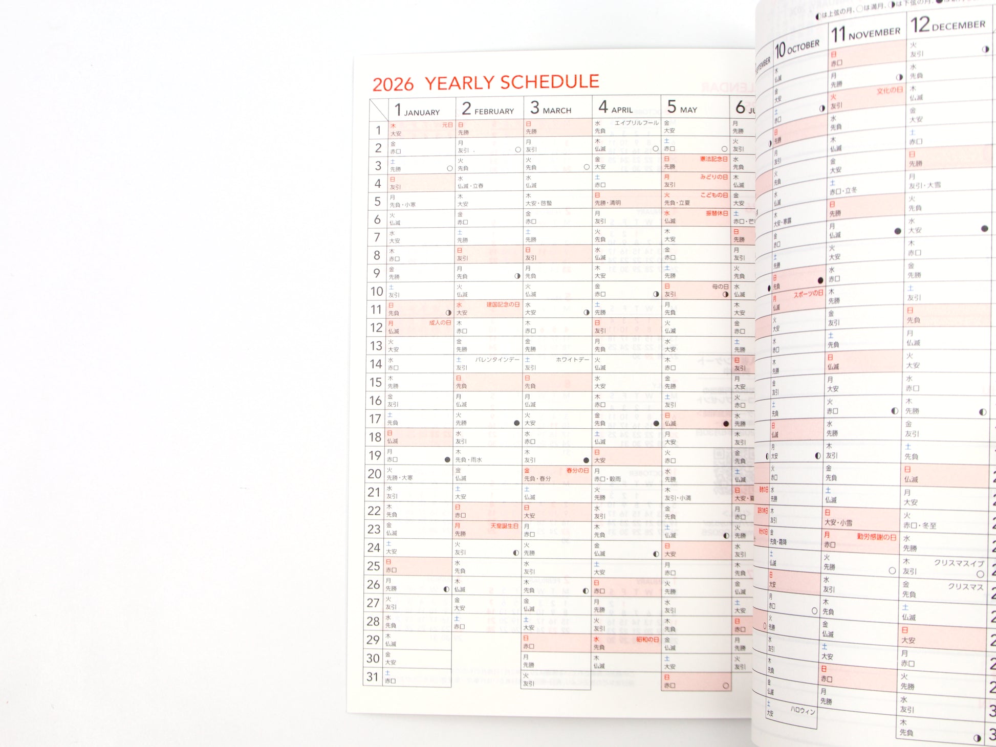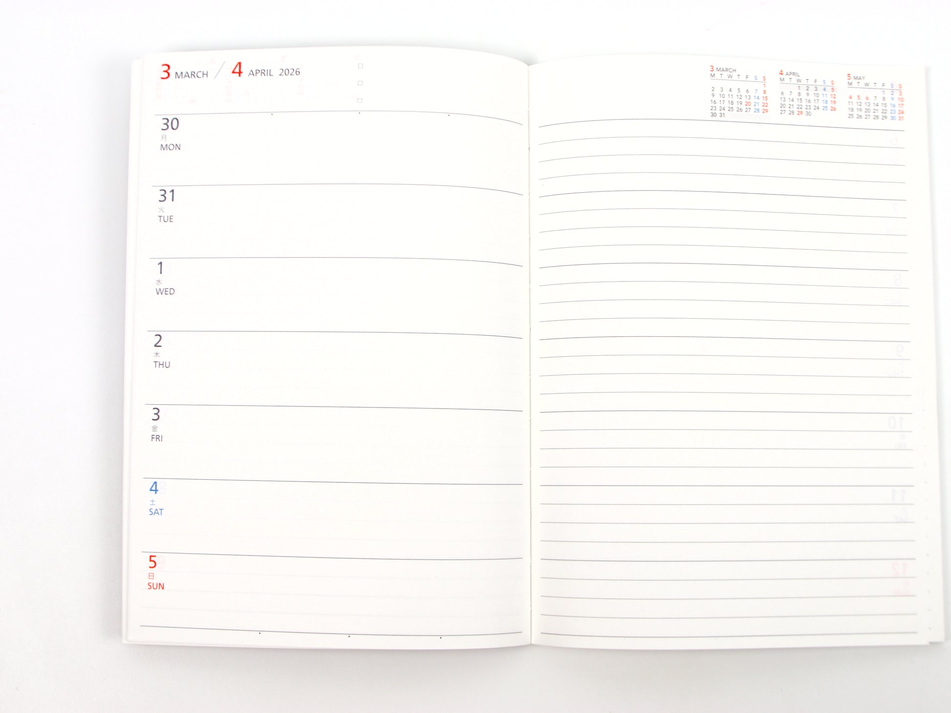 - Yearly Schedule and Week-on-two-pages (days on left side, lined ruling on right side)