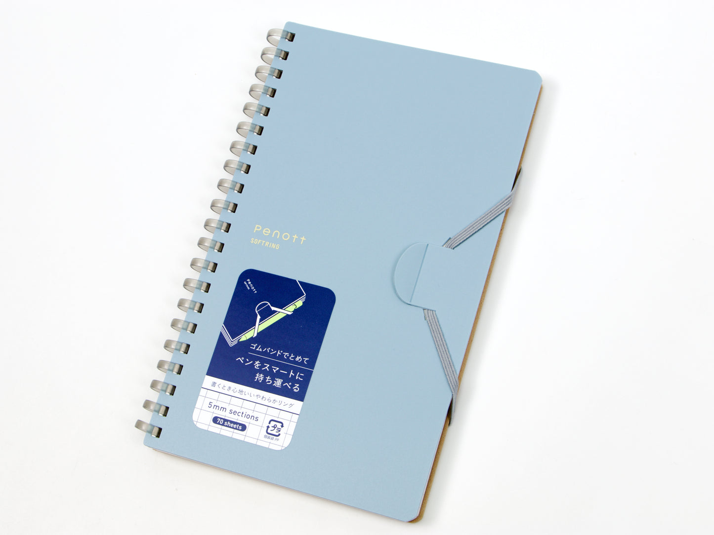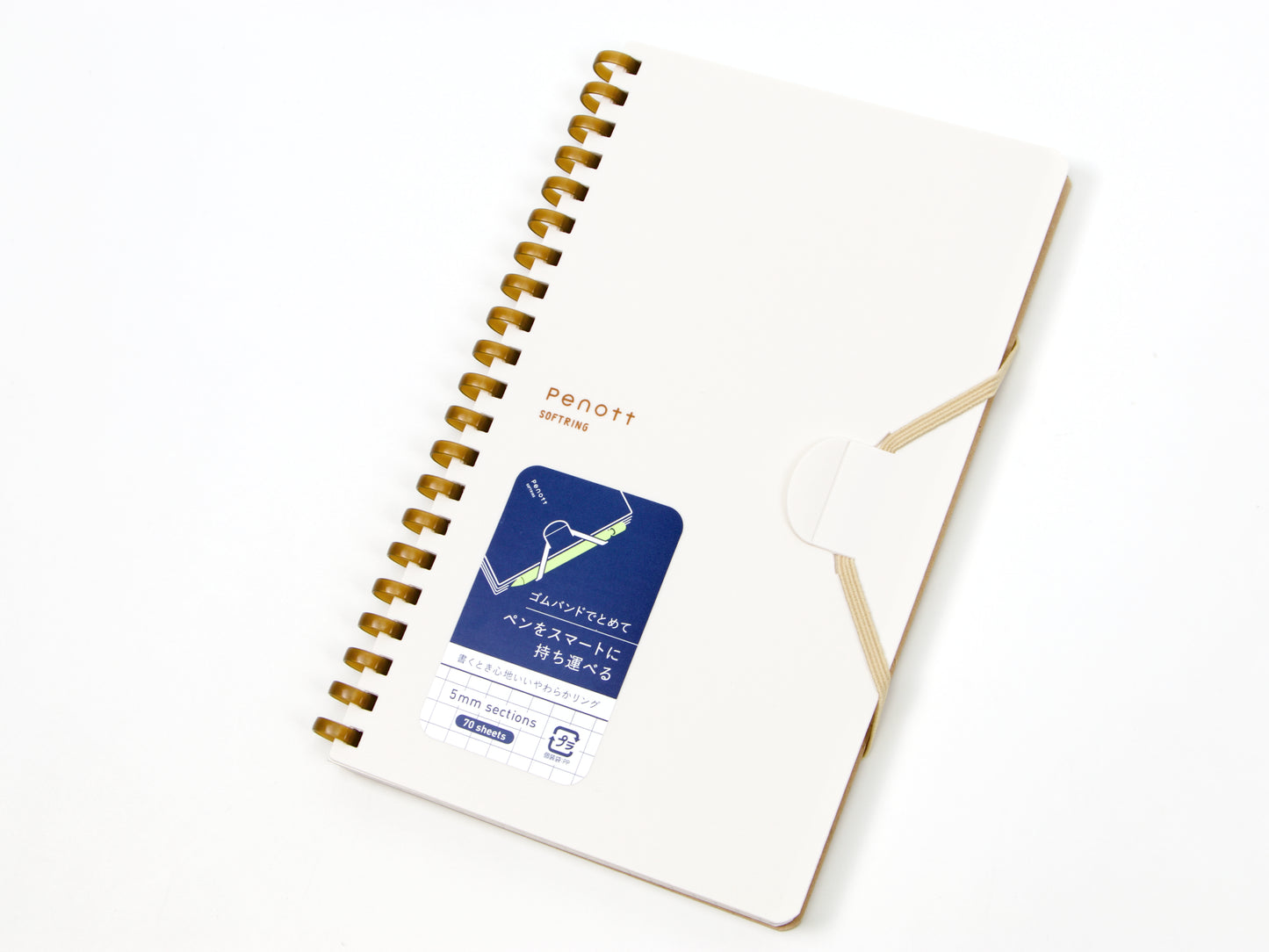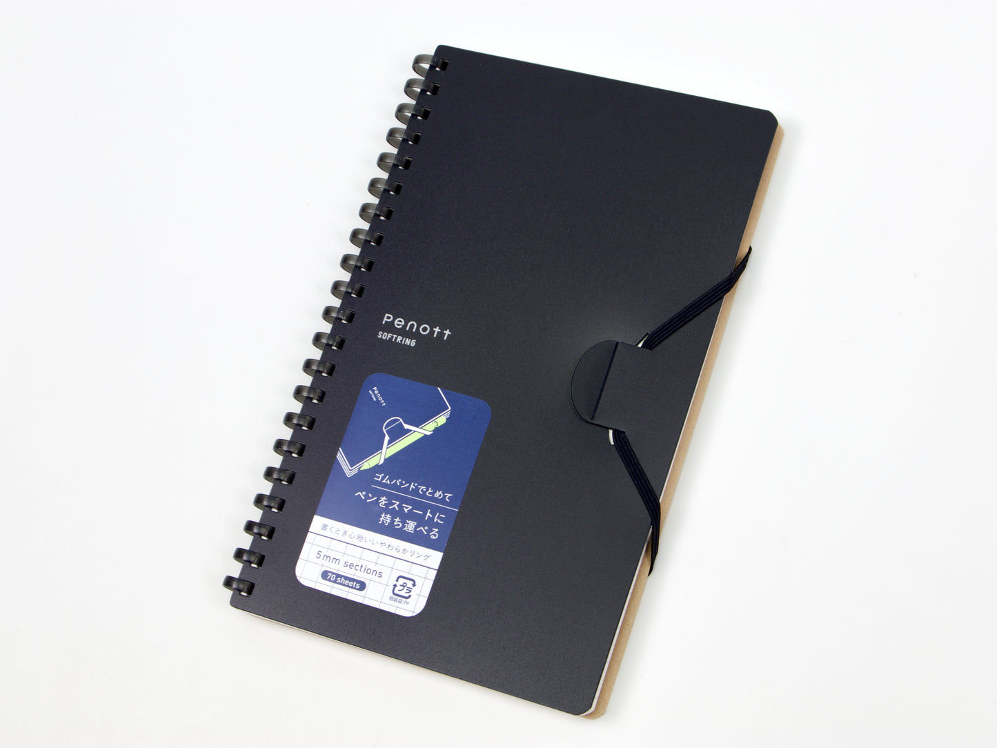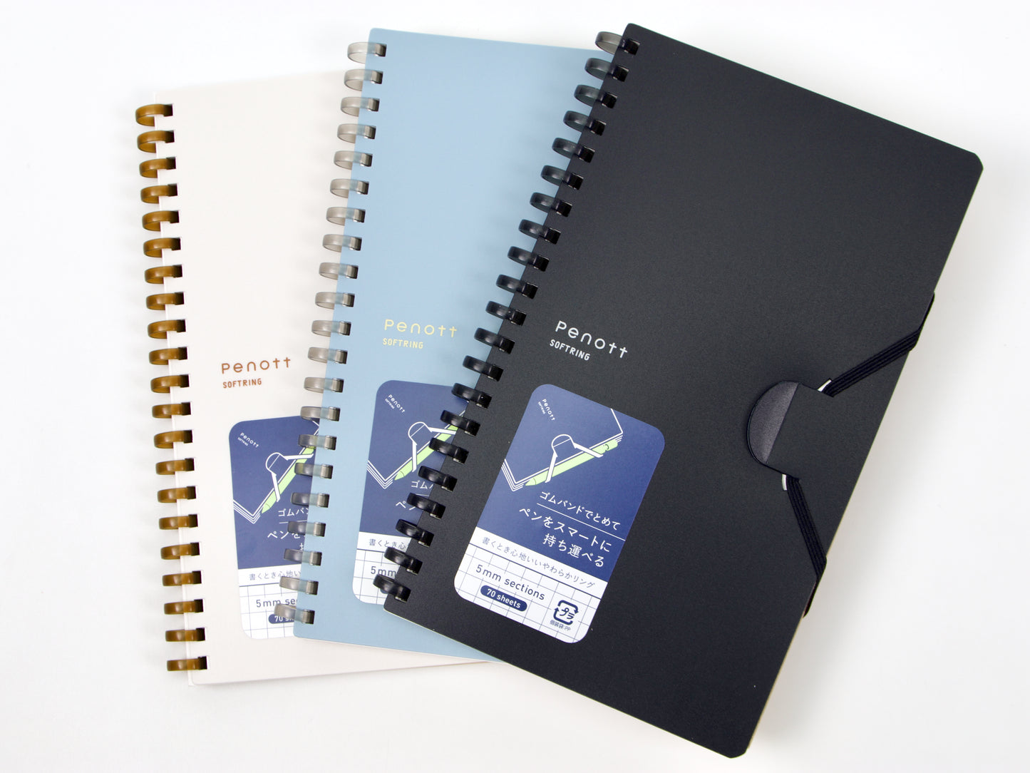 Kokuyo Penott Soft Ring A5 notebook was designed to be great for both work and leisure. Pages are 5mm grid. 70 sheets per notebook. Soft plastic front and stiff cardboard back with an elastic closure band that also serves as a pen holder. The slim size makes it easy to carry around or have next to your keyboard. Japanese A5-Slim notebook size measures 5 1/2" X 8 1/4". It is approximately 1" slimmer than the standard A5 size.
