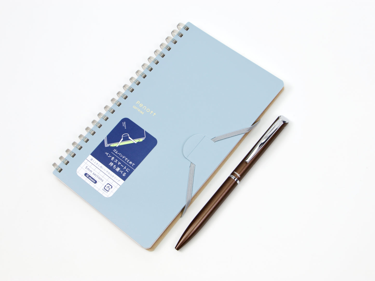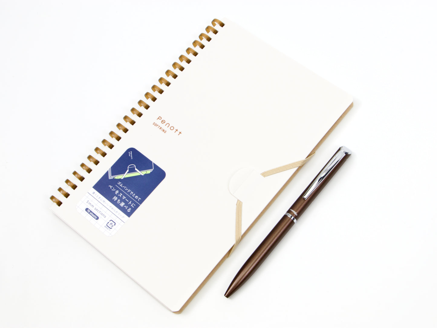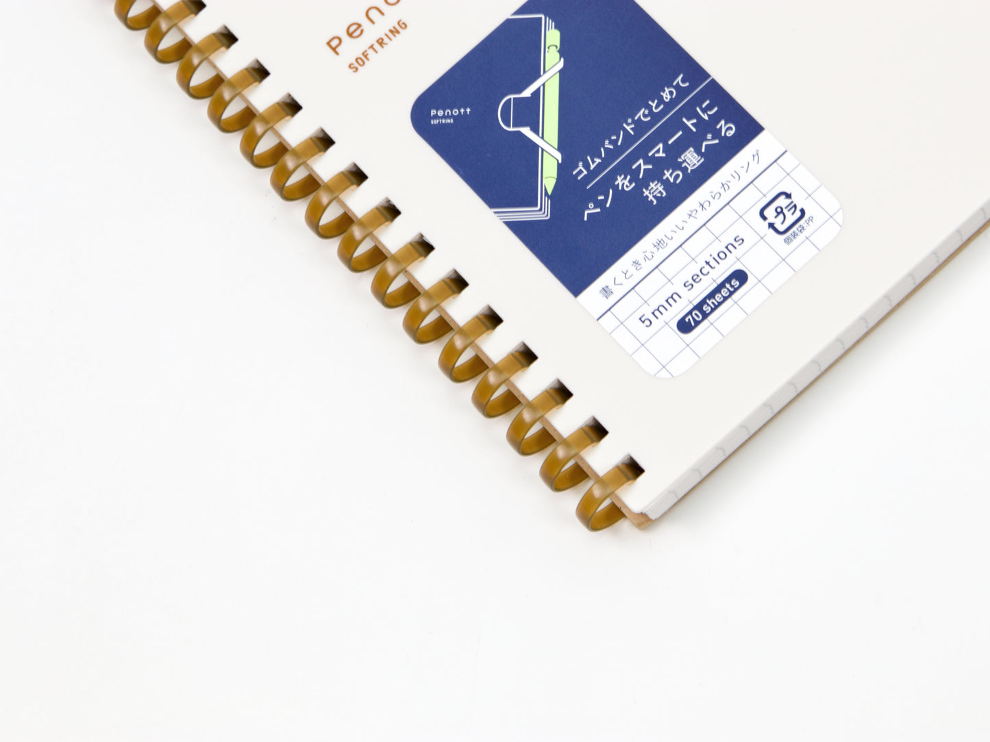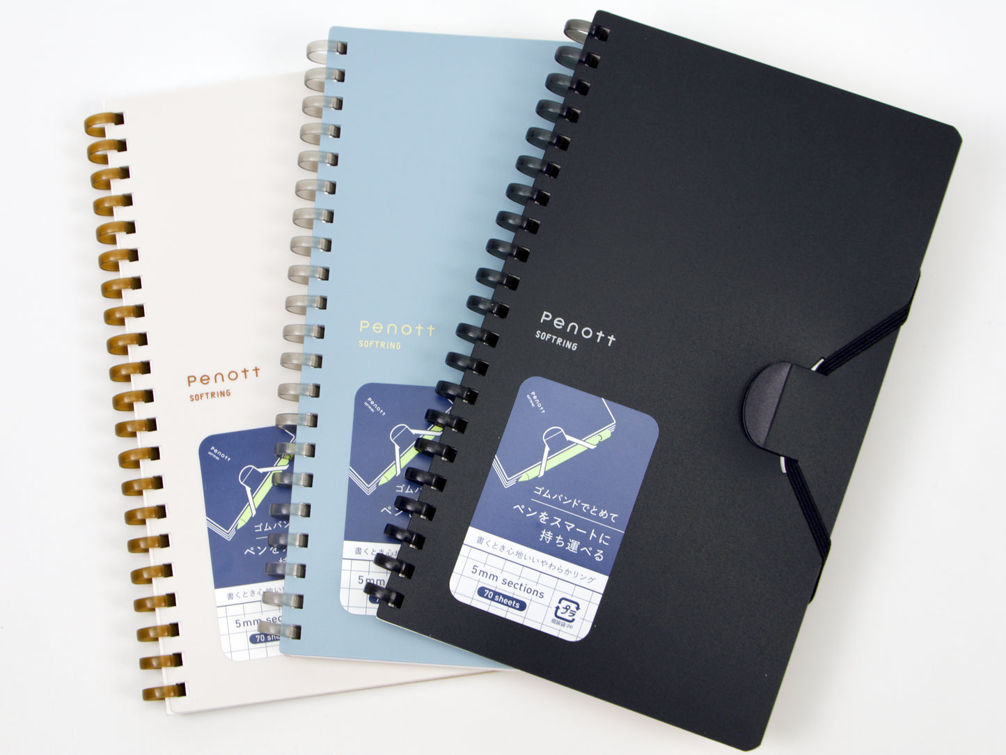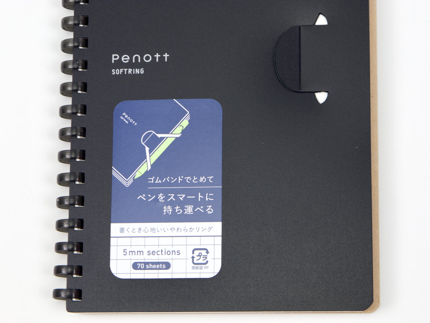 Kokuyo Penott Soft Ring A5 notebook was designed to be great for both work and leisure. Pages are 5mm grid. 70 sheets per notebook. Soft plastic front and stiff cardboard back with an elastic closure band that also serves as a pen holder. The slim size makes it easy to carry around or have next to your keyboard. Japanese A5-Slim notebook size measures 5 1/2" X 8 1/4". It is approximately 1" slimmer than the standard A5 size.