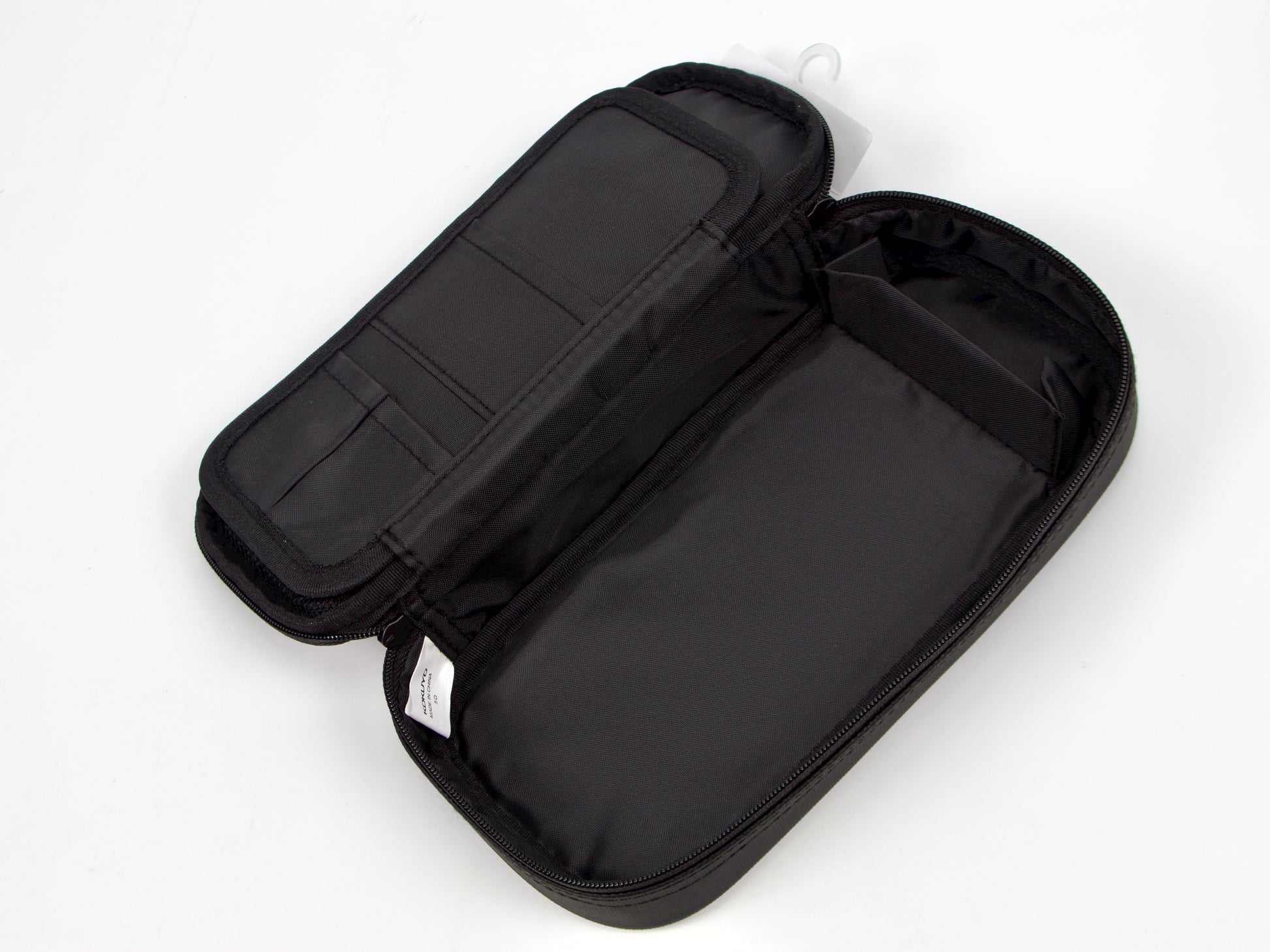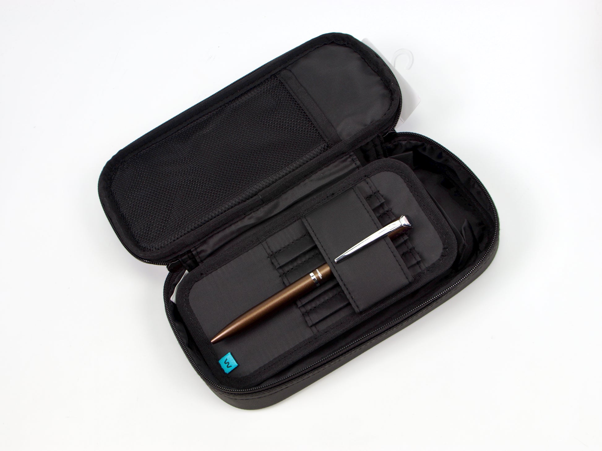 The thoughtfully designed interior maximizes both capacity and organization. The upper section features a mesh pocket ideal for rulers and accessories, plus a pen tray with wave holders. Flip the tray up to reveal a spacious lower compartment with dividers and pockets for additional writing tools and small items. This dual-layer system holds approximately 20 pens while keeping everything neatly sorted and visible.