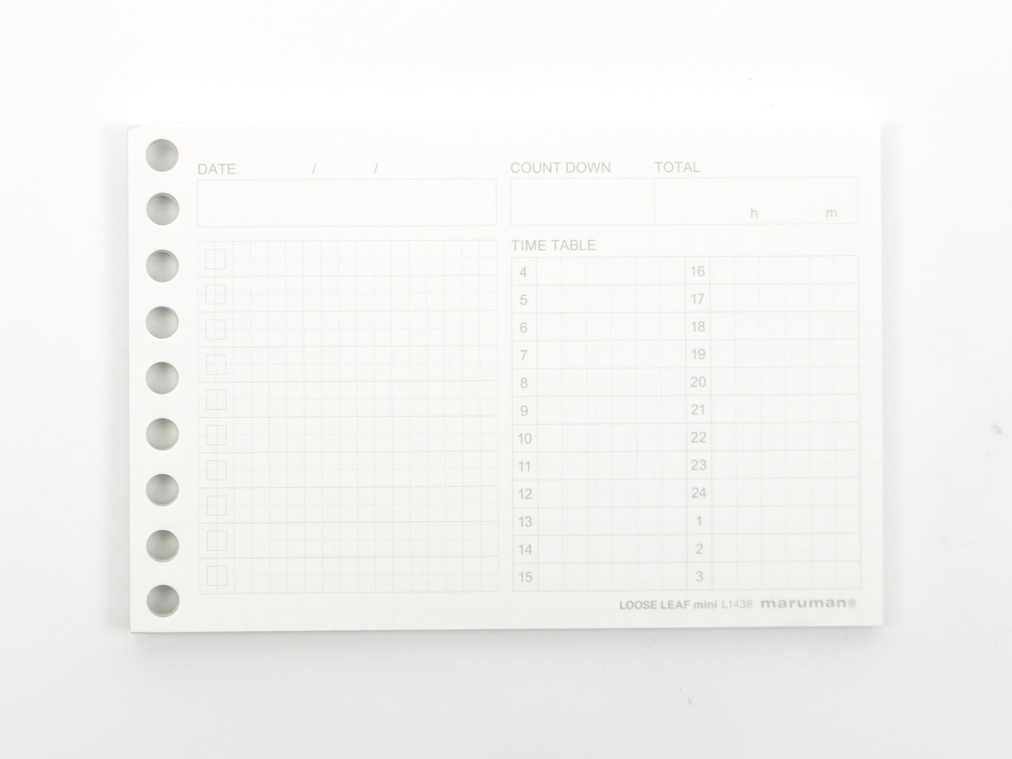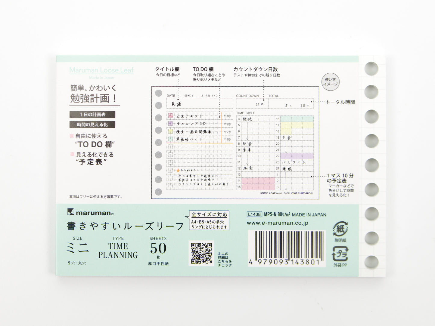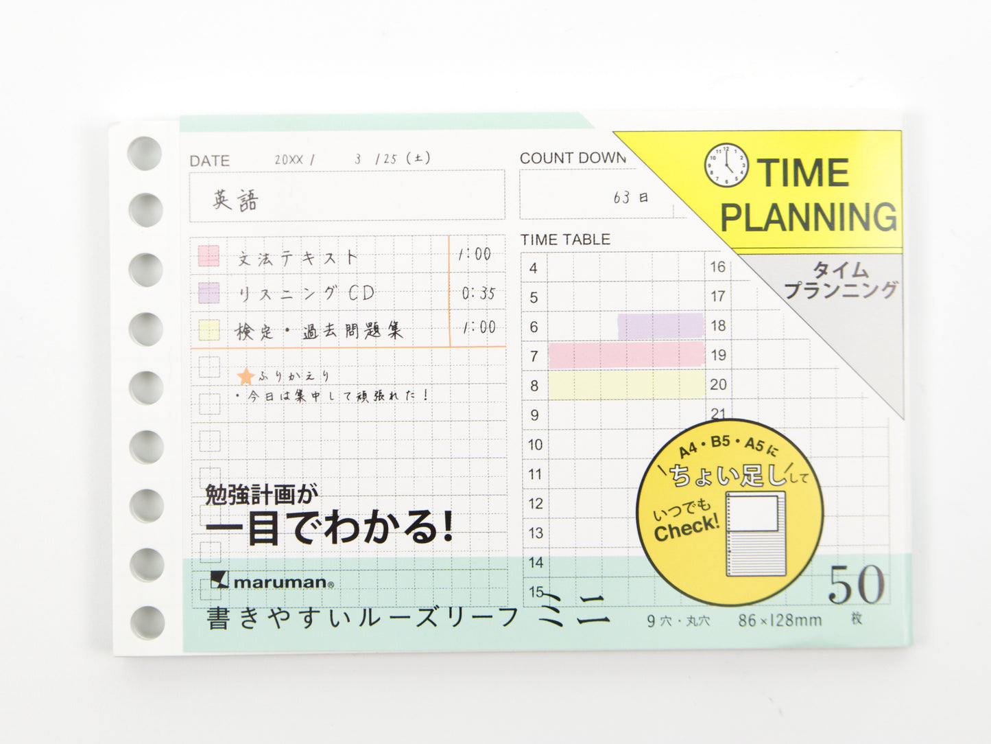 These Time Planning refills fit the Mini Session Binder and provide 50 sheets of organized time planning paper perfect for study planning. The Maruman Mini Session binder is a handy "one-hand" size perfect for carrying all the essential points! You can also use these sheets in larger Maruman binders. The Mini Session size is perfect for studying, especially on the go.
