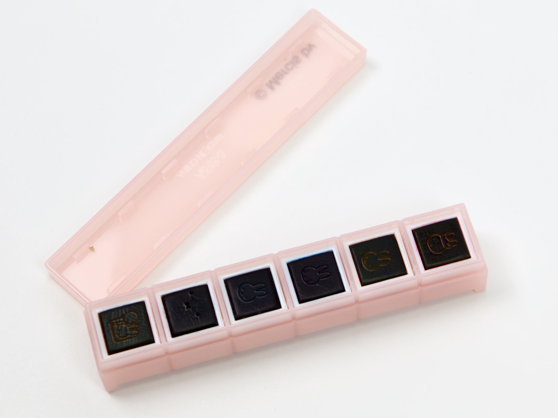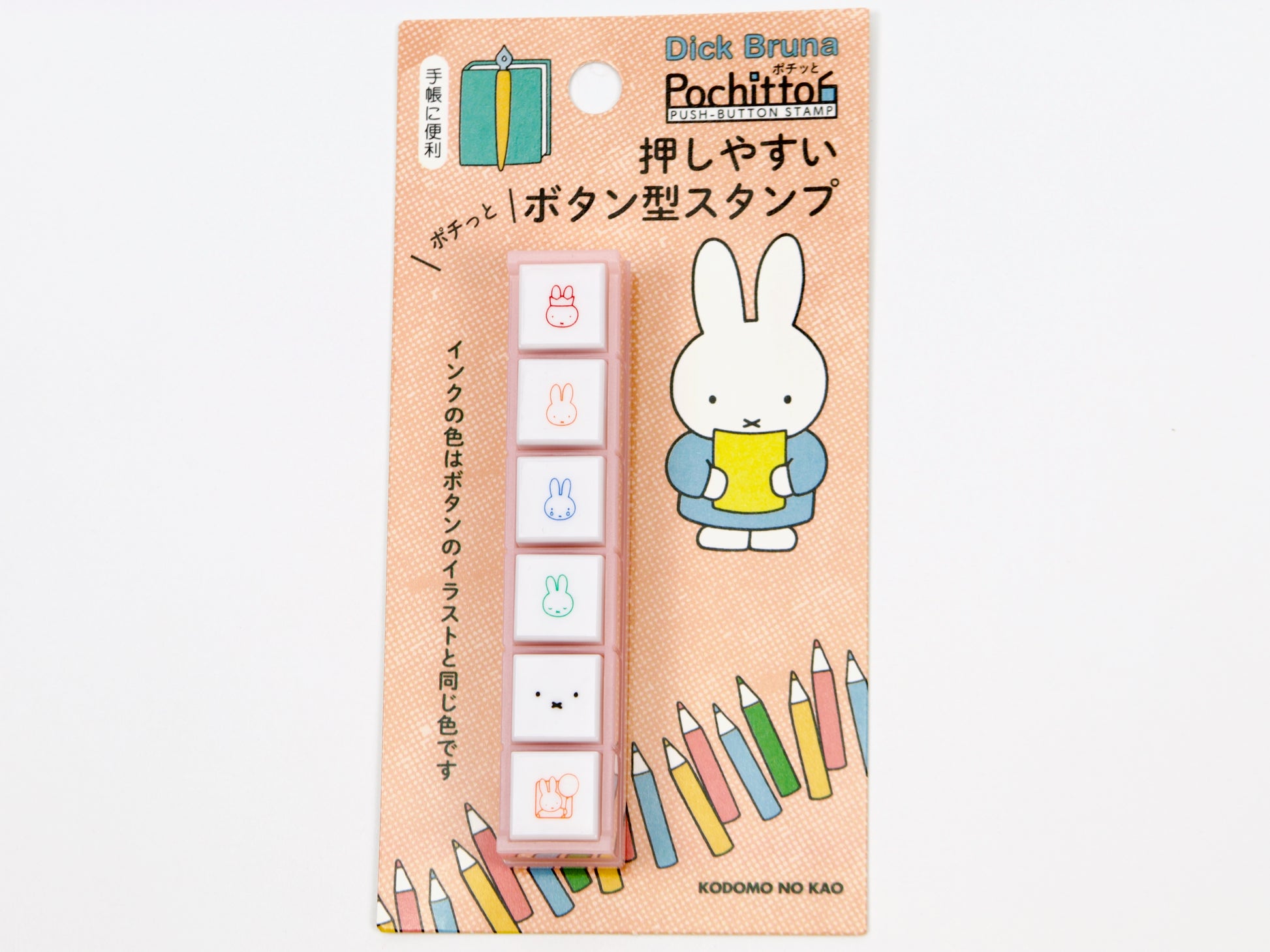 This set of cute push-button stamps are self-inking with a tight sealing lid, so you can pop them in your pen case and decorate on the go! Featuring six Miffy designs, each with a different color ink that matches the stamp face. These adorable stamps fit nicely on notebook and planning pages, but they're perfect for envelopes and letters too. Pochitto refers to the Japanese onomatopoeia most similar to "click!" in English, and clicking the various buttons is very satisfying!