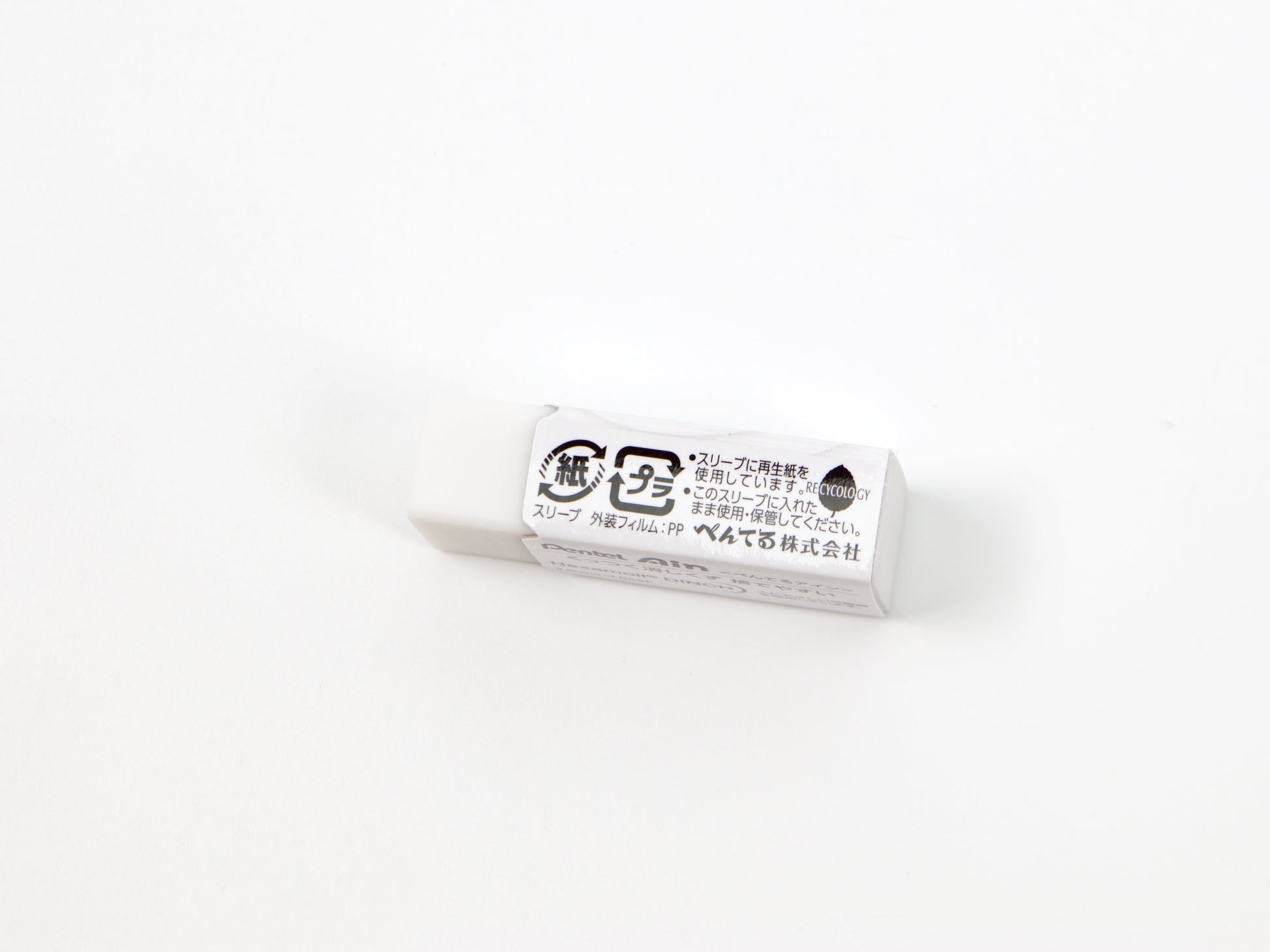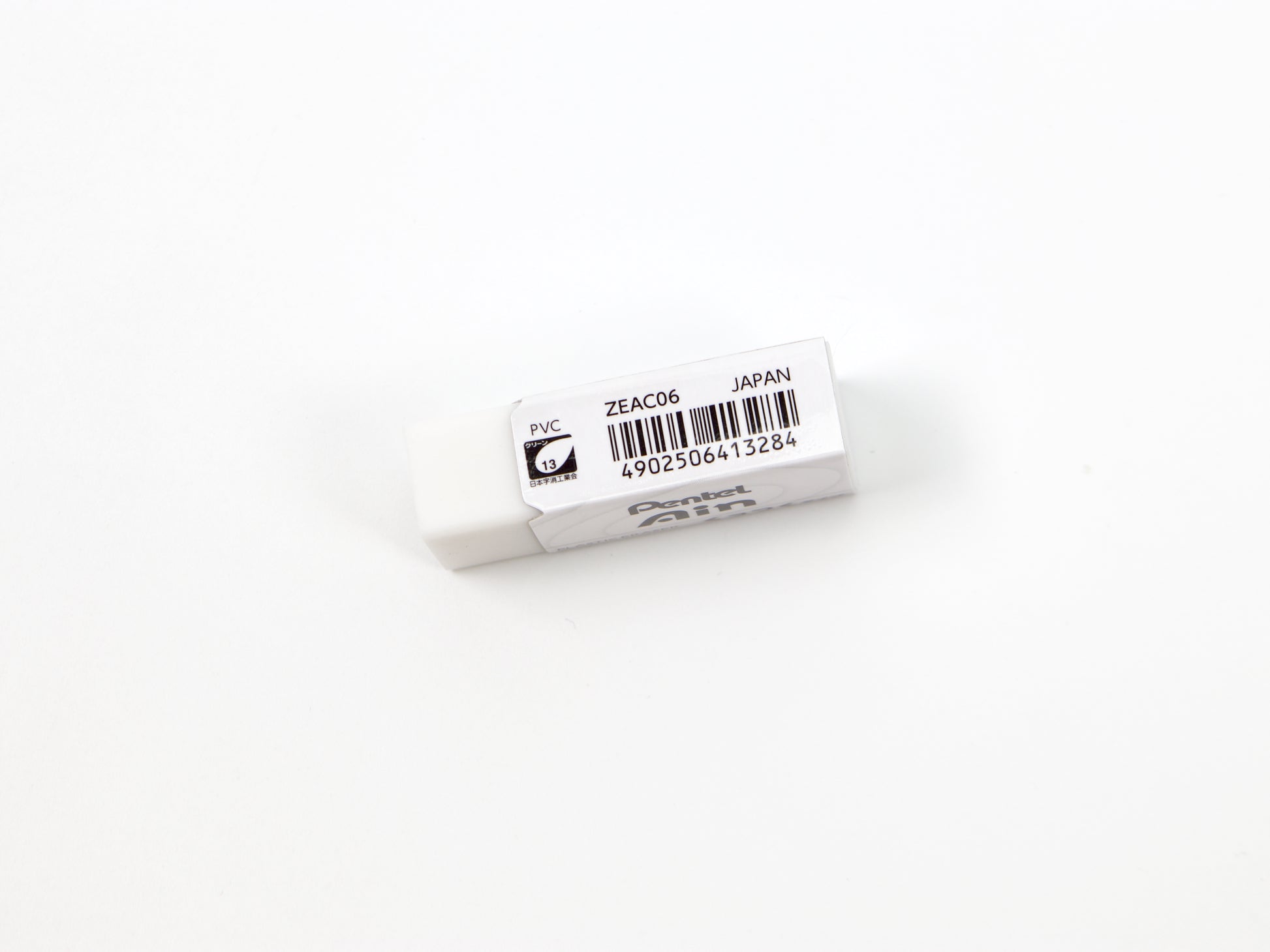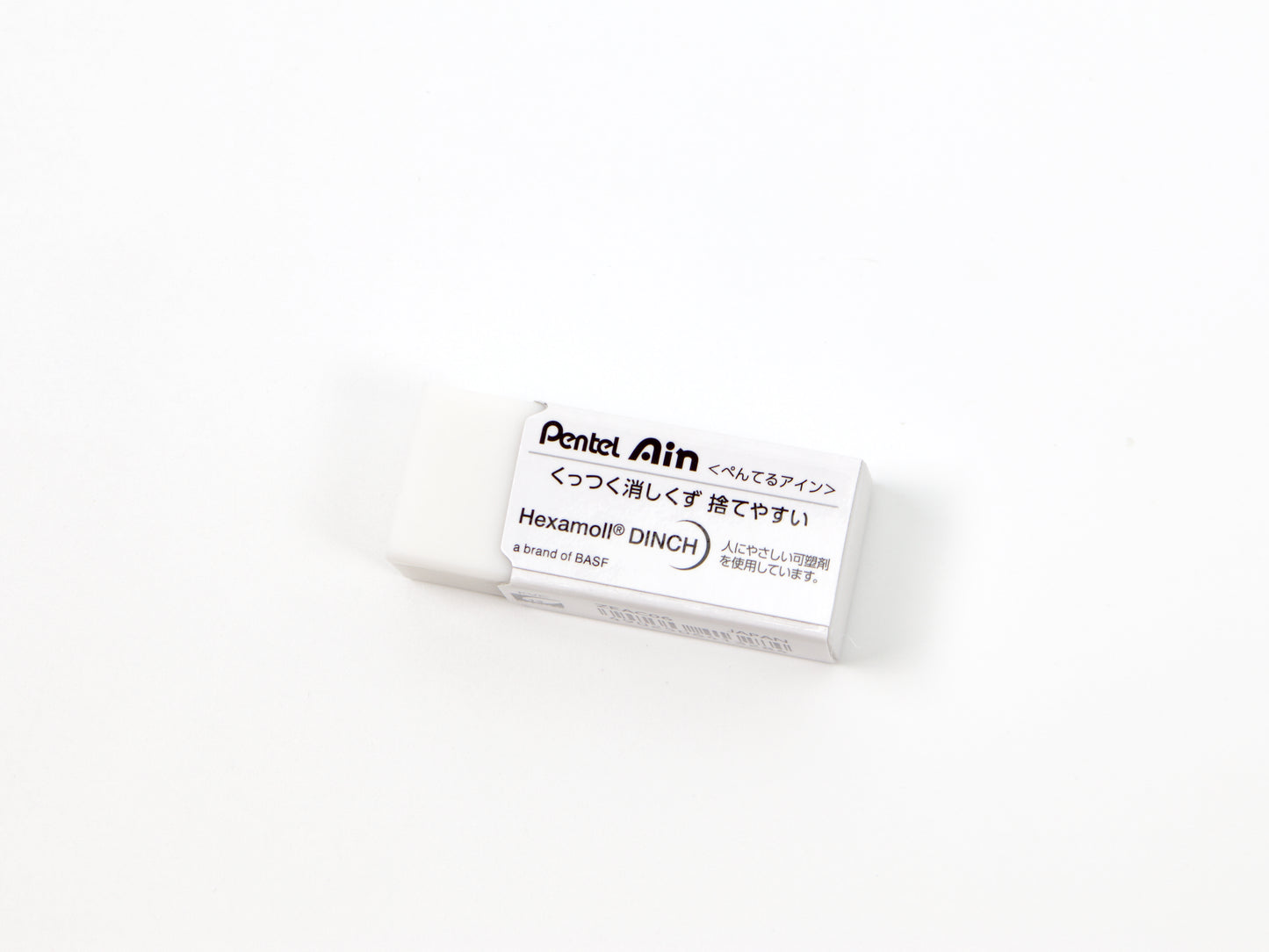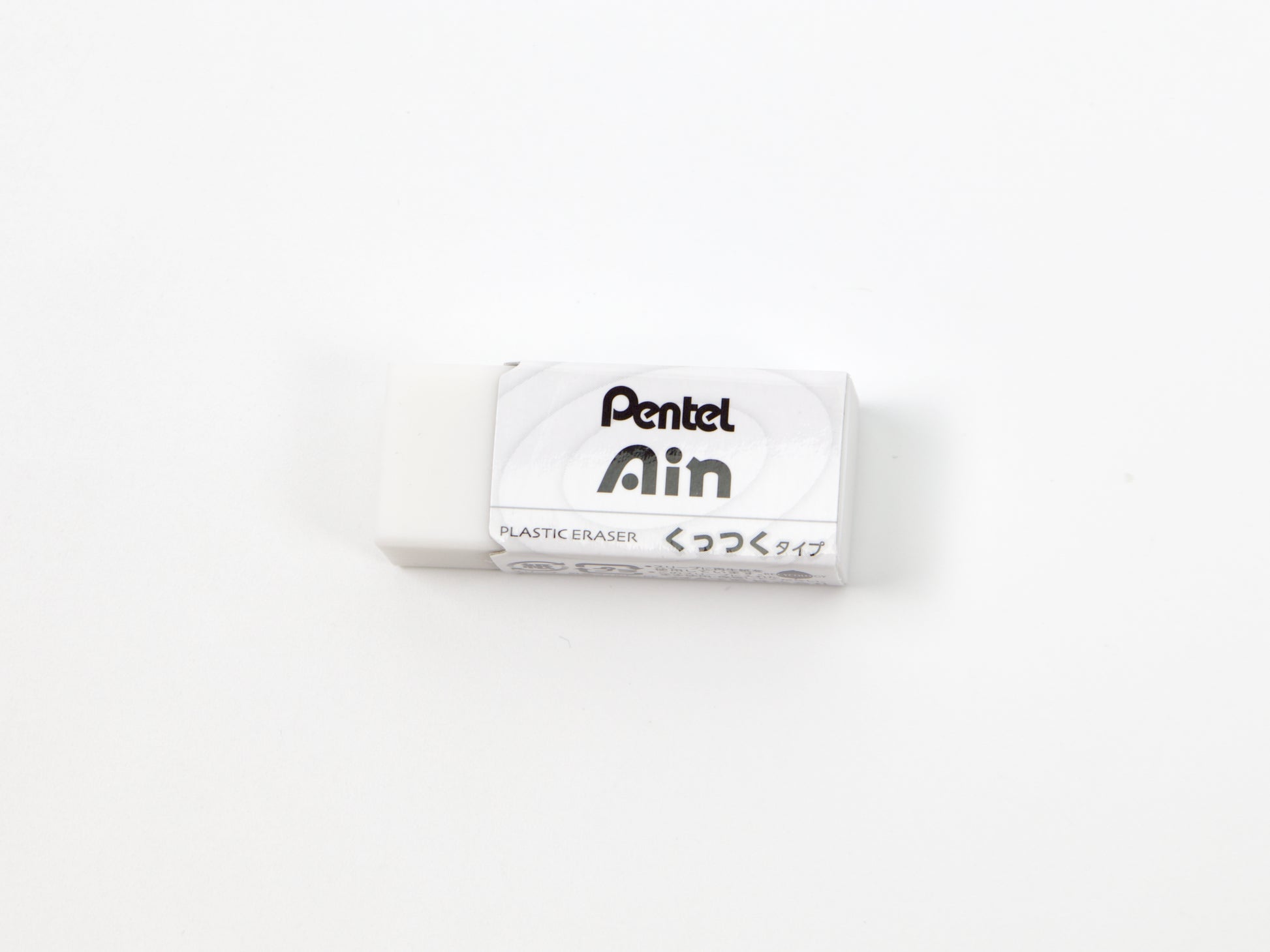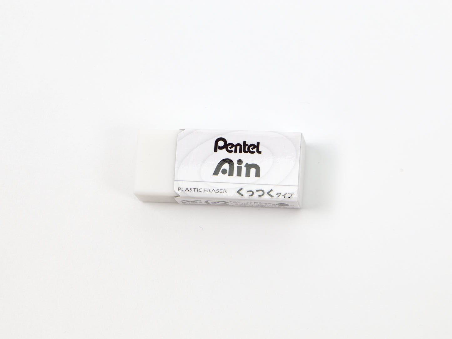 Pentel Ain Kuttsuku (Sticking Type) Hi-Polymer eraser is made especially for effectively erasing while creating less eraser 'dust.' Kuttsuku refers to this erasers ability to gather up the eraser residue into clumps, giving a cleaner erasing experience. Eraser measures: 43mm x 18mm x 13mm.