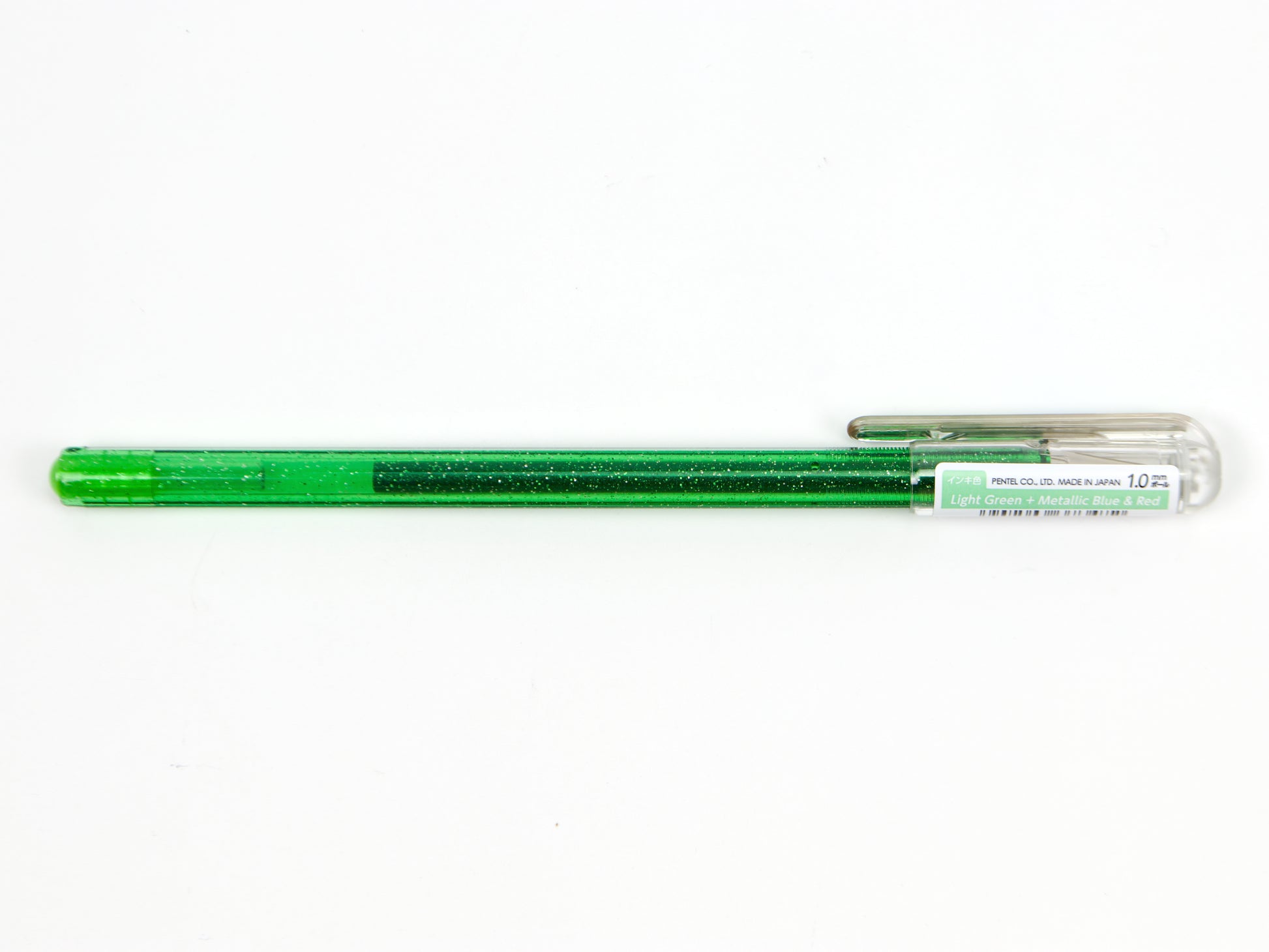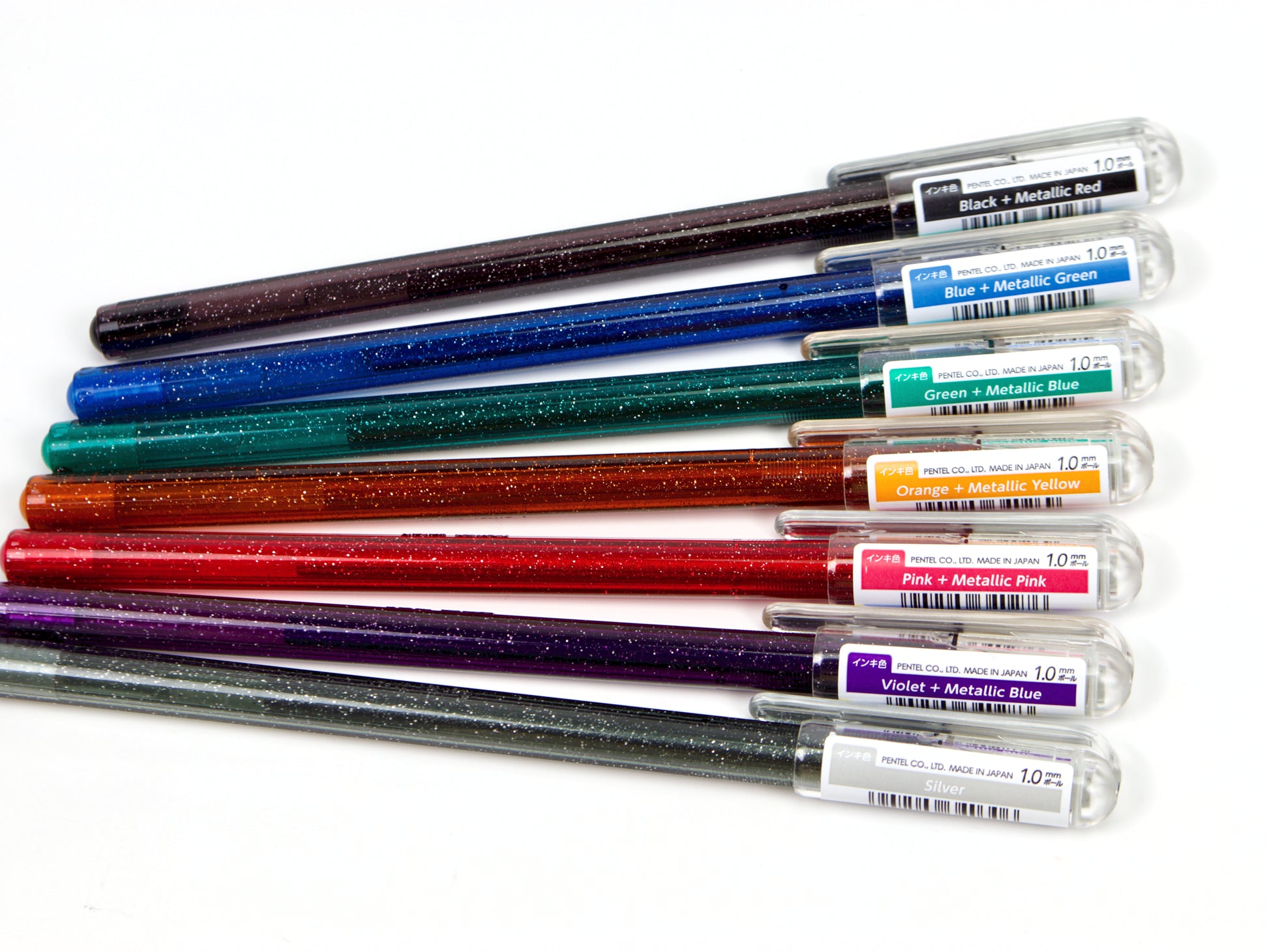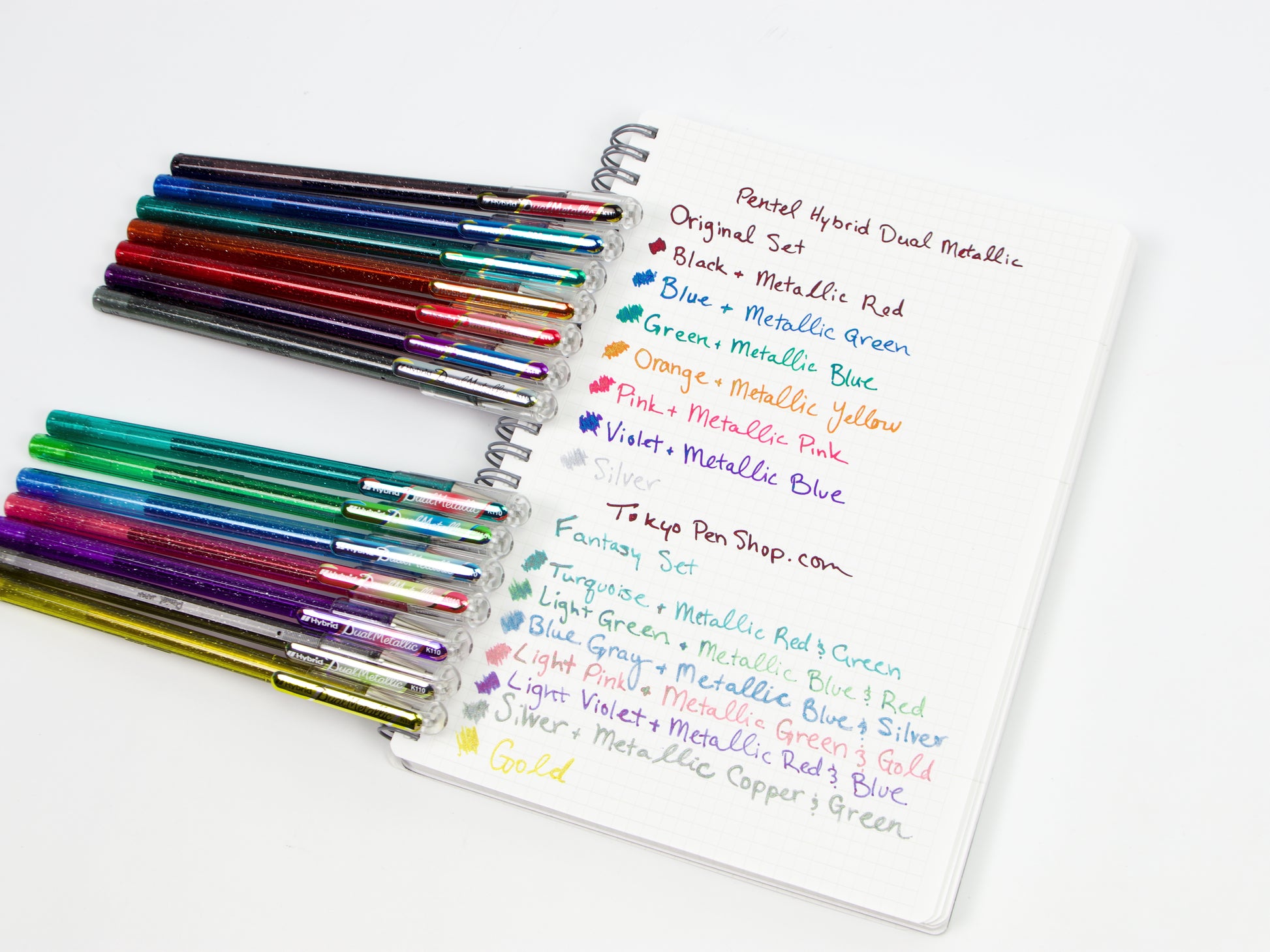 The Pentel Hybrid Dual Metallic is a sparkly metallic dual-color lamé pigment ink pen with a 1.0 mm ball tip. For the limited winter 2025 release, they have added 7 brand new Dual Metallic Colors! The color combinations in this line are stunning, and they look great on both white and black paper! Choose from 14 dazzling, dynamic colors! This product is only available for a limited time!