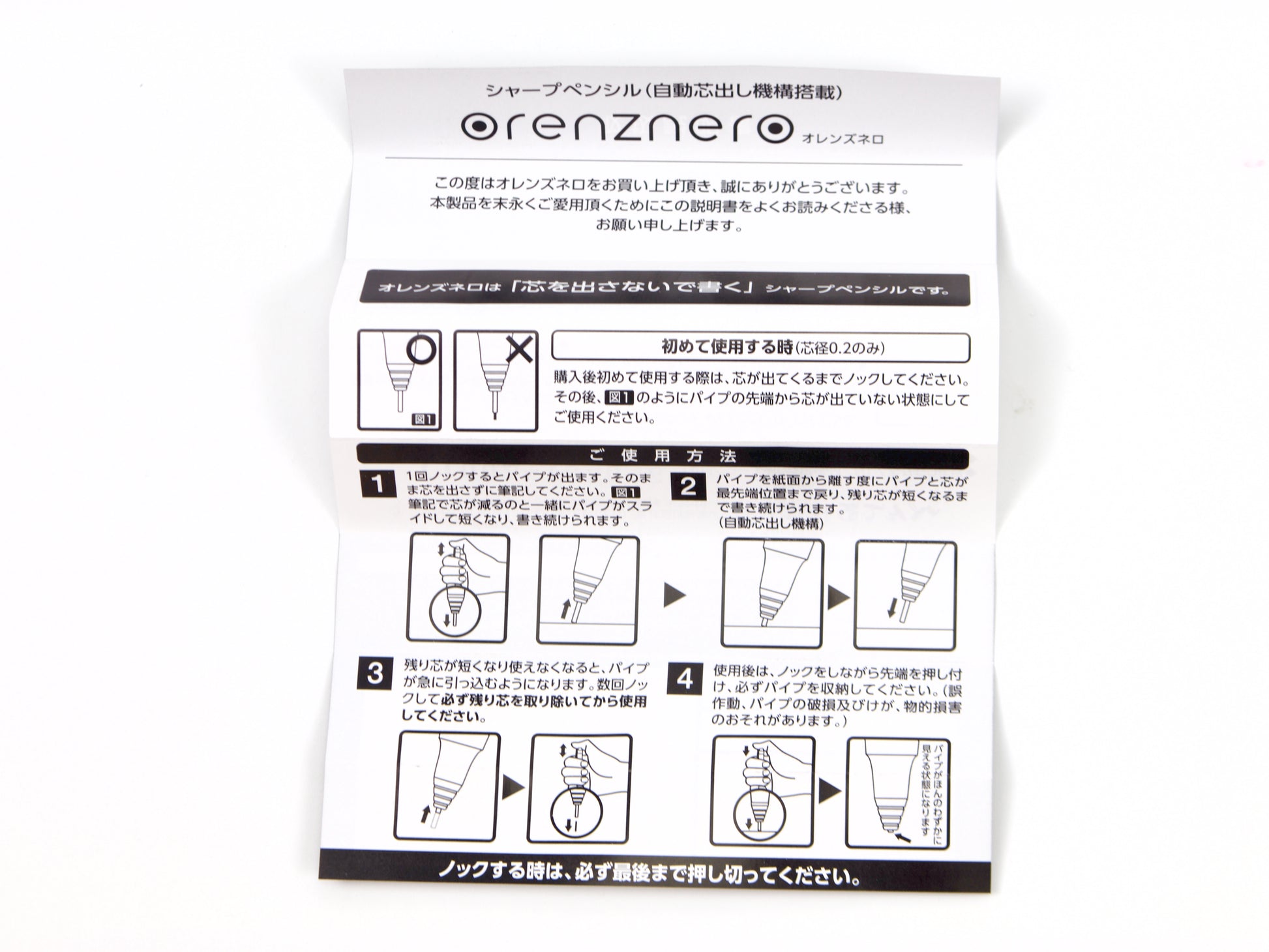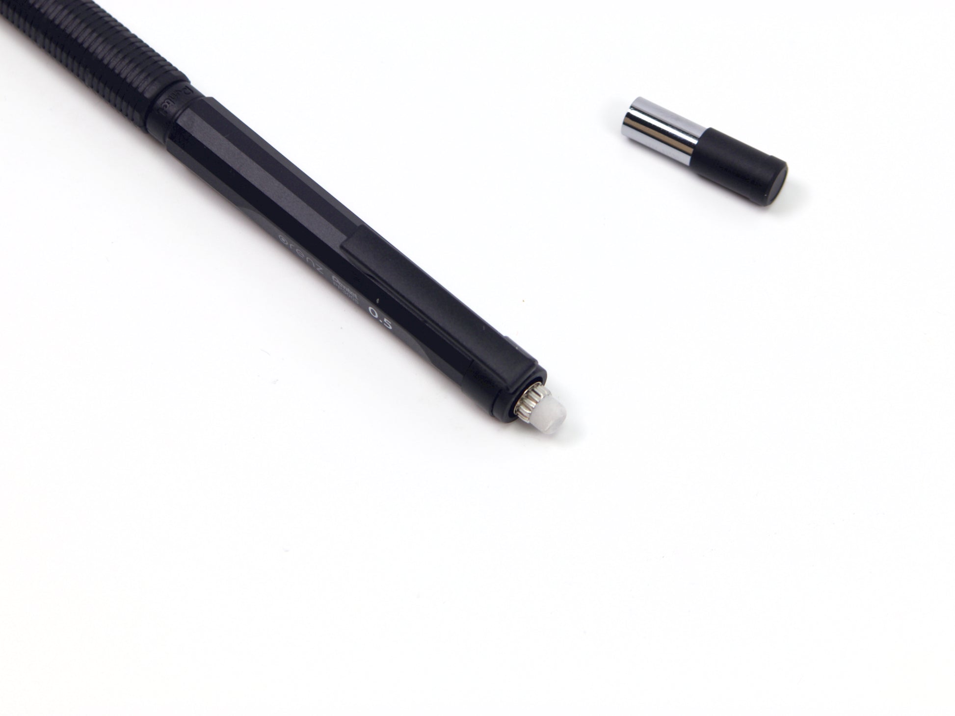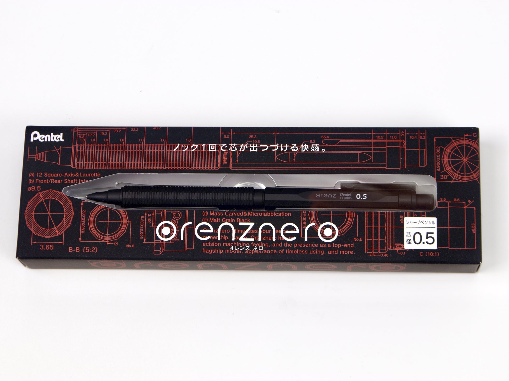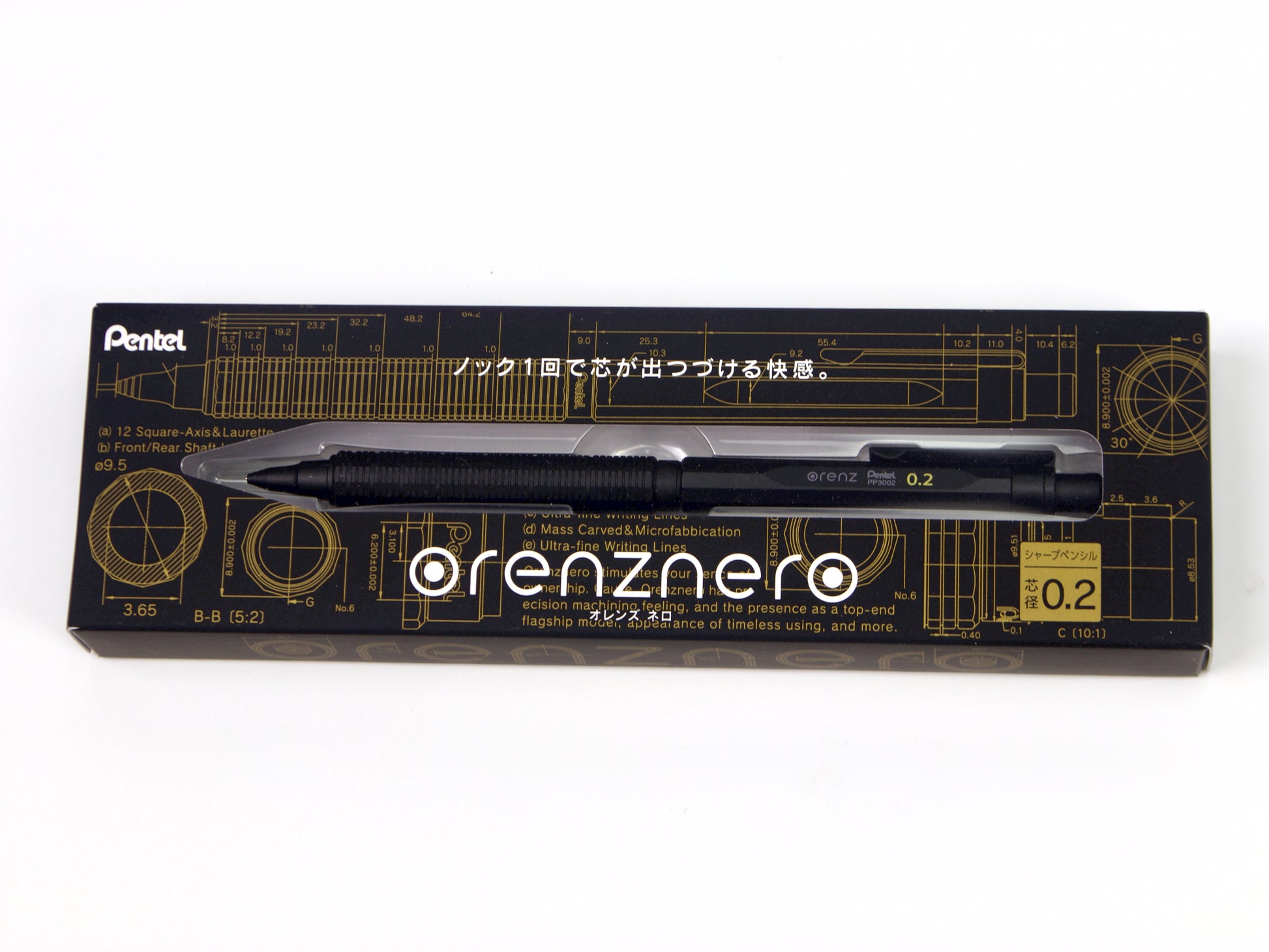 Pentel Orenz Nero – The Pinnacle of Mechanical Pencil Innovation The evolution of the mechanical pencil has always been driven by the pursuit of perfection in its core: the refill. In 1960, Pentel revolutionized writing with the world’s first thin, break-resistant resin lead, paving the way for the first knock-type mechanical pencil. Today, that legacy reaches its peak with the Pentel Orenz Nero—the ultimate mechanical pencil that brings us closer than ever to the ideal of continuous writing without lead breakage. At the heart of the Orenz Nero is the Orenz Nero System, engineered to protect even the most delicate 0.2mm lead from breaking. This cutting-edge technology is paired with a fully automatic lead advancement mechanism, which advances the lead every time the pen tip lifts from the paper—eliminating the need for repeated clicks. One knock is all it takes to write uninterrupted until the lead runs out. Designed to be as durable as it is refined, the Orenz Nero features a matte black finish—a nod to Pentel’s iconic Graph 1000 and Smash models—and gets its name from “Nero,” the Italian word for black. Its 12-sided barrel, reminiscent of a precisely carved block of metal, is crafted from a unique blend of resin and metal, creating a strong, tactile writing instrument. Engineered for comfort, the pencil’s low center of gravity ensures optimal control and an effortlessly smooth writing experience. The sliding pipe mechanism supports and protects the lead as you write, allowing for consistent precision—even with ultra-fine tips. This is not just a pencil. It’s Pentel’s finest expression of half a century of innovation—a tool for those who demand strength, elegance, and flawless performance in every stroke. Experience the Orenz Nero. Experience the best of Pentel. We recommend using the Ain Stein lead in this pencil.