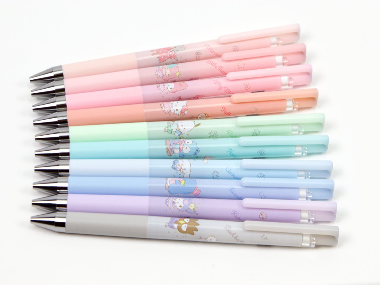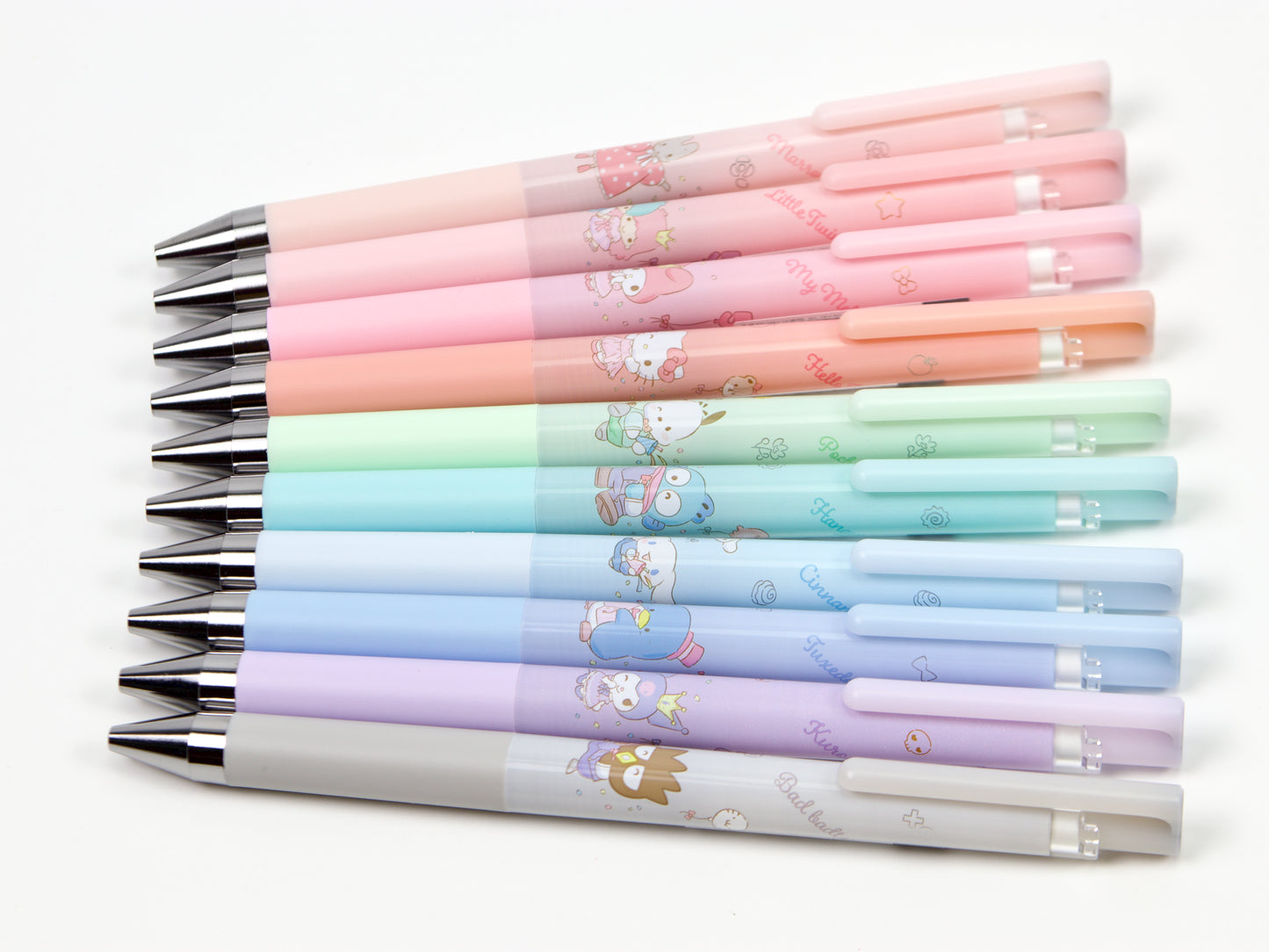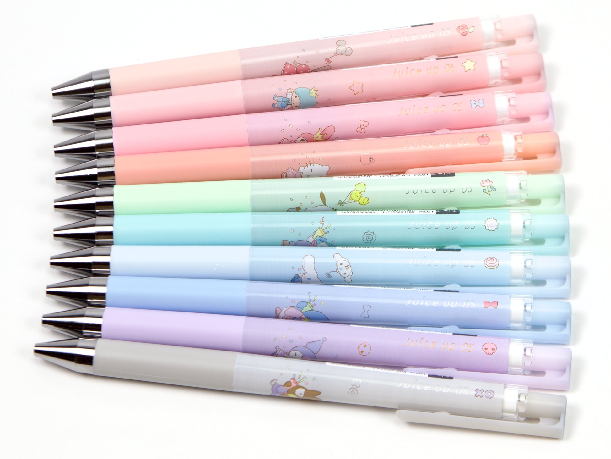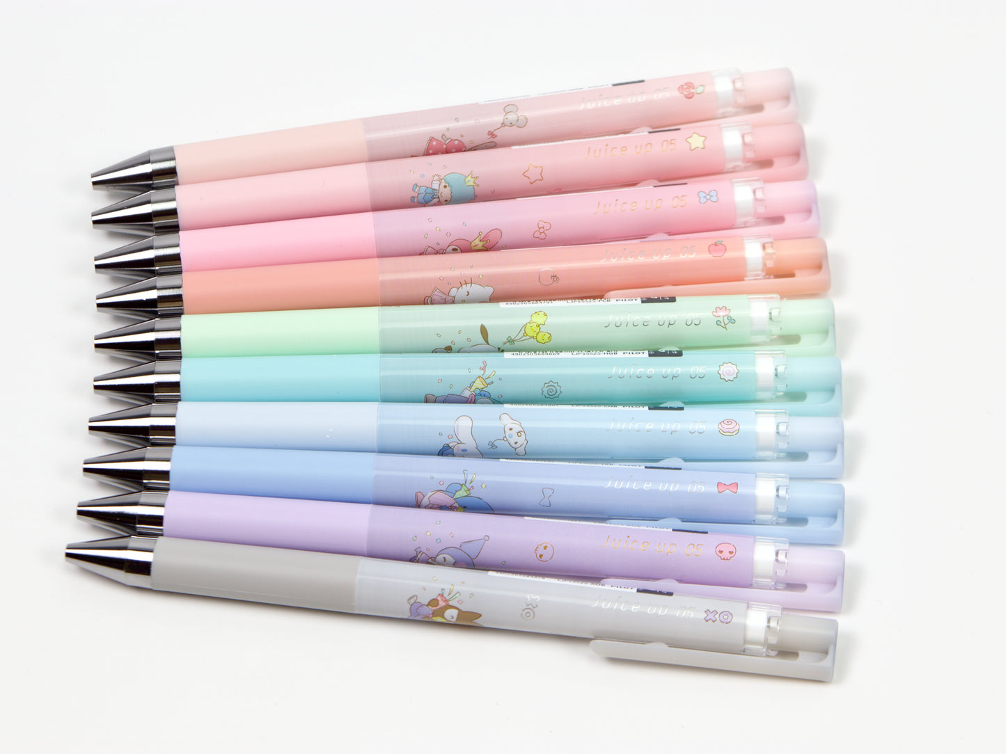 These limited edition Juice-Up bodies feature some favorite Sanrio characters: Hello Kitty, Kuromi, My Melody, Bad Badtz Maru, Little Twin Stars, Pochacco, Tuxedo Sam, Cinnamoroll, Hangyodon, and Marroncream. Each Sanrio Juice Up contains .5mm black gel ink and is refillable. The Pilot Juice Up has the cult favorite synergy tip, which is an innovative hybrid tip between a conical and needle-nose. The Juice Up body is weighted more toward the bottom for a smoother writing experience. The grip is also very comfortable. Juice Up ink is a water-based pigment ink that is both water and light resistant.