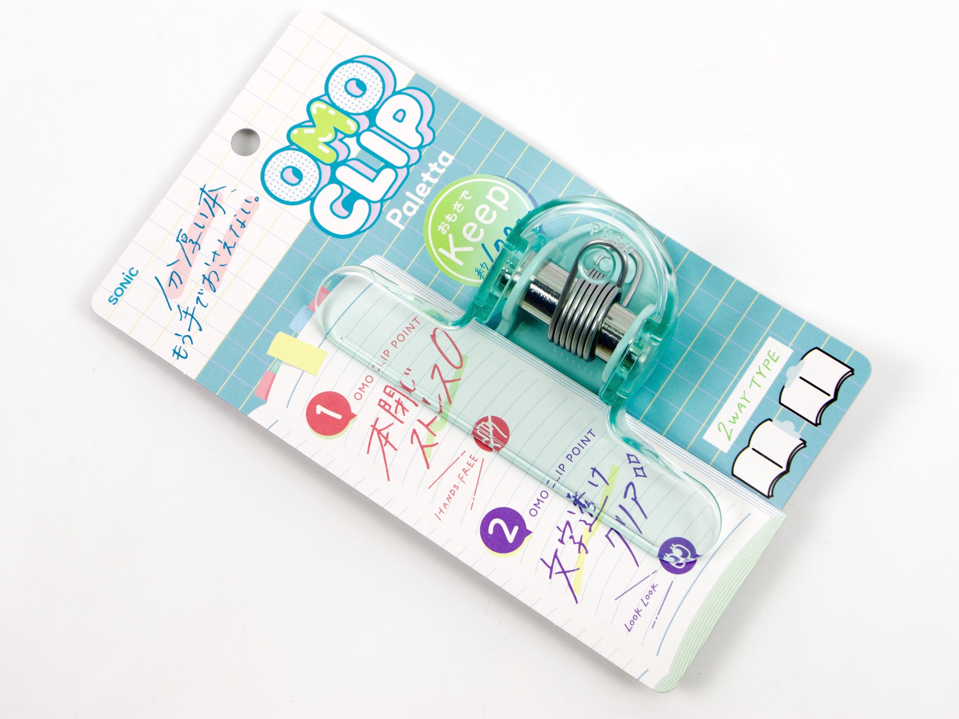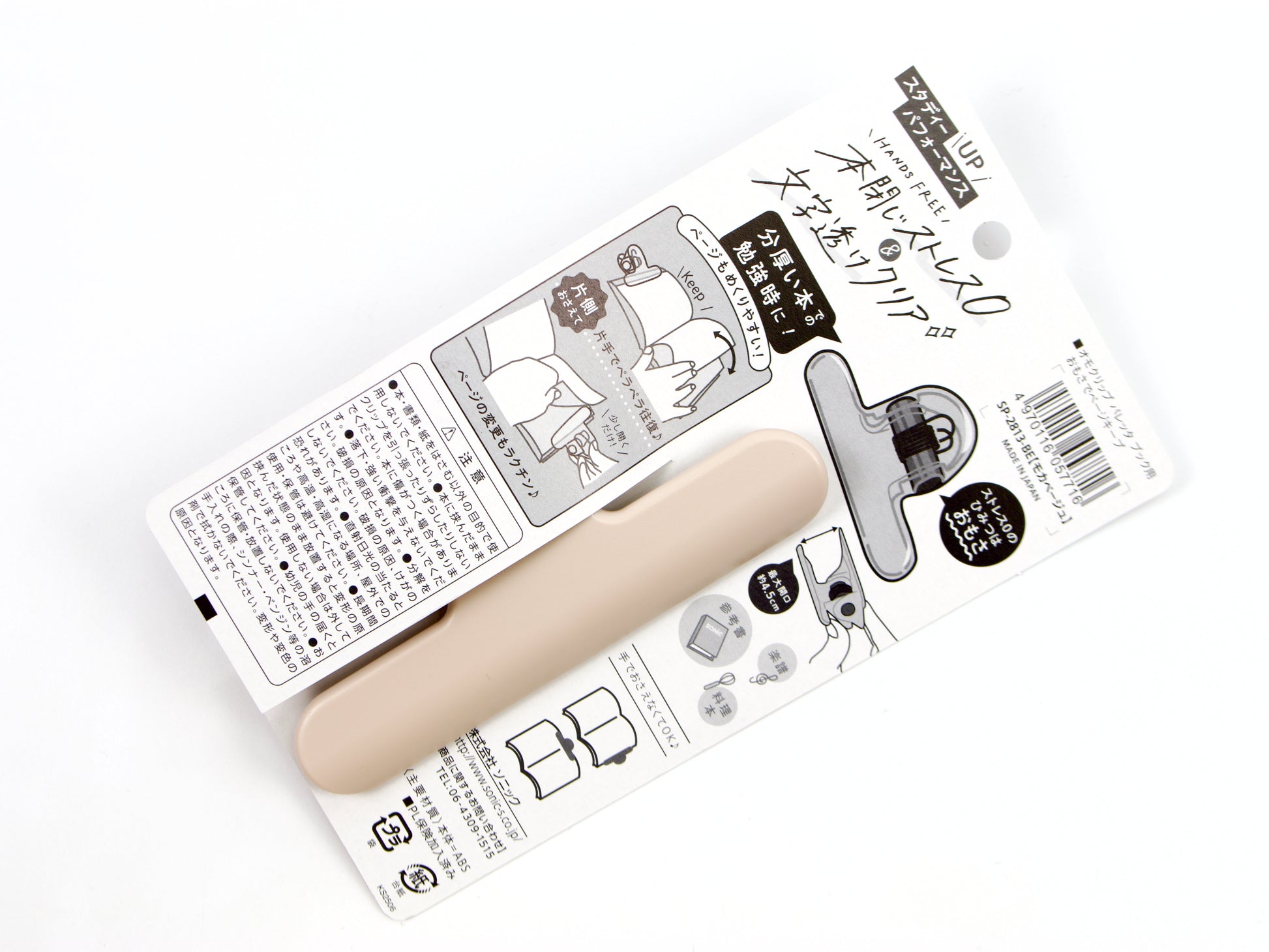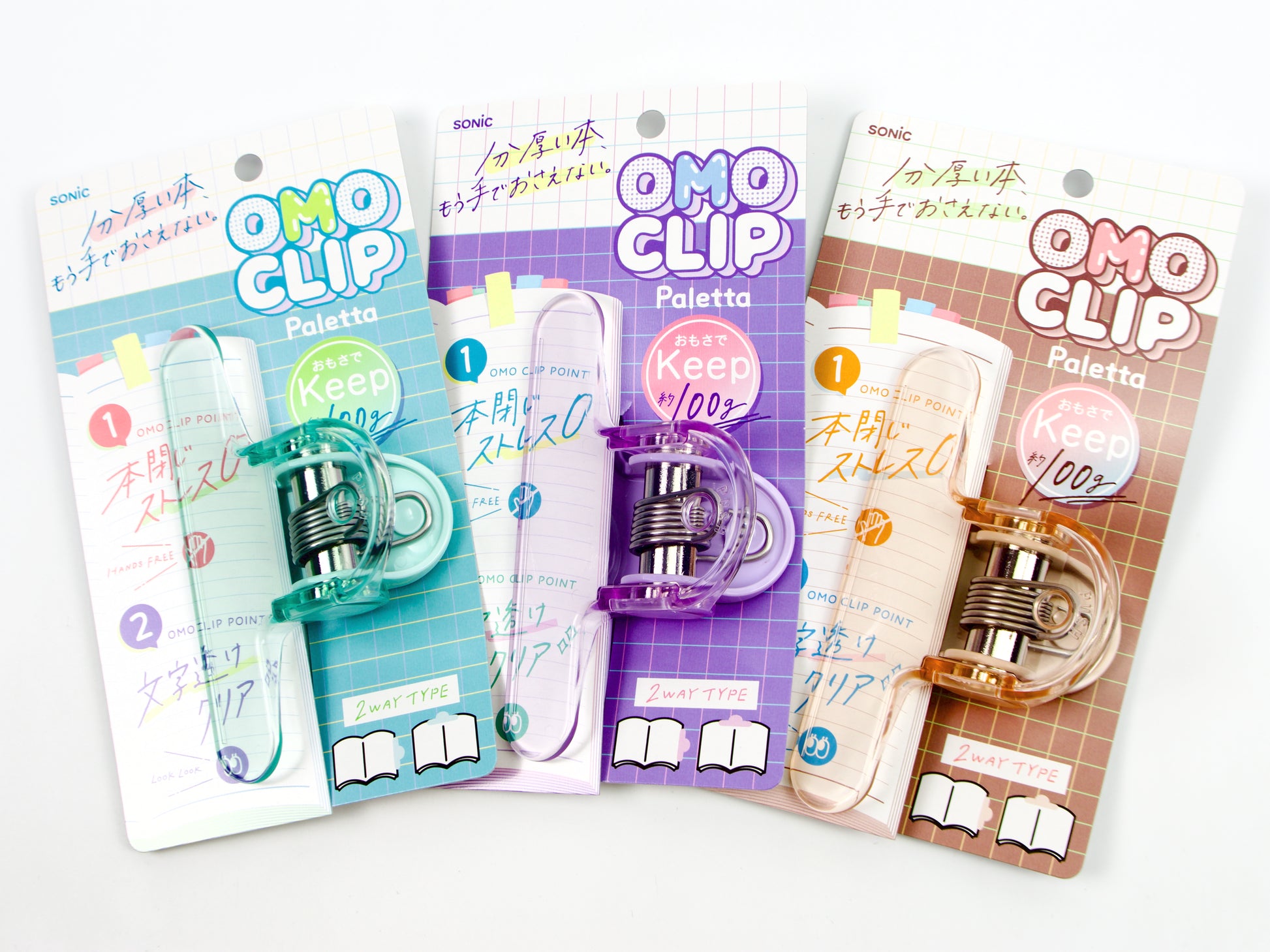 A big, strong clip that keeps you on the page you want to see! Choose from mocha beige, green, and violet. This clip is designed to use both along the side of a book to hold pages open and along the top to lay your book open. It is also great to use with music books!
