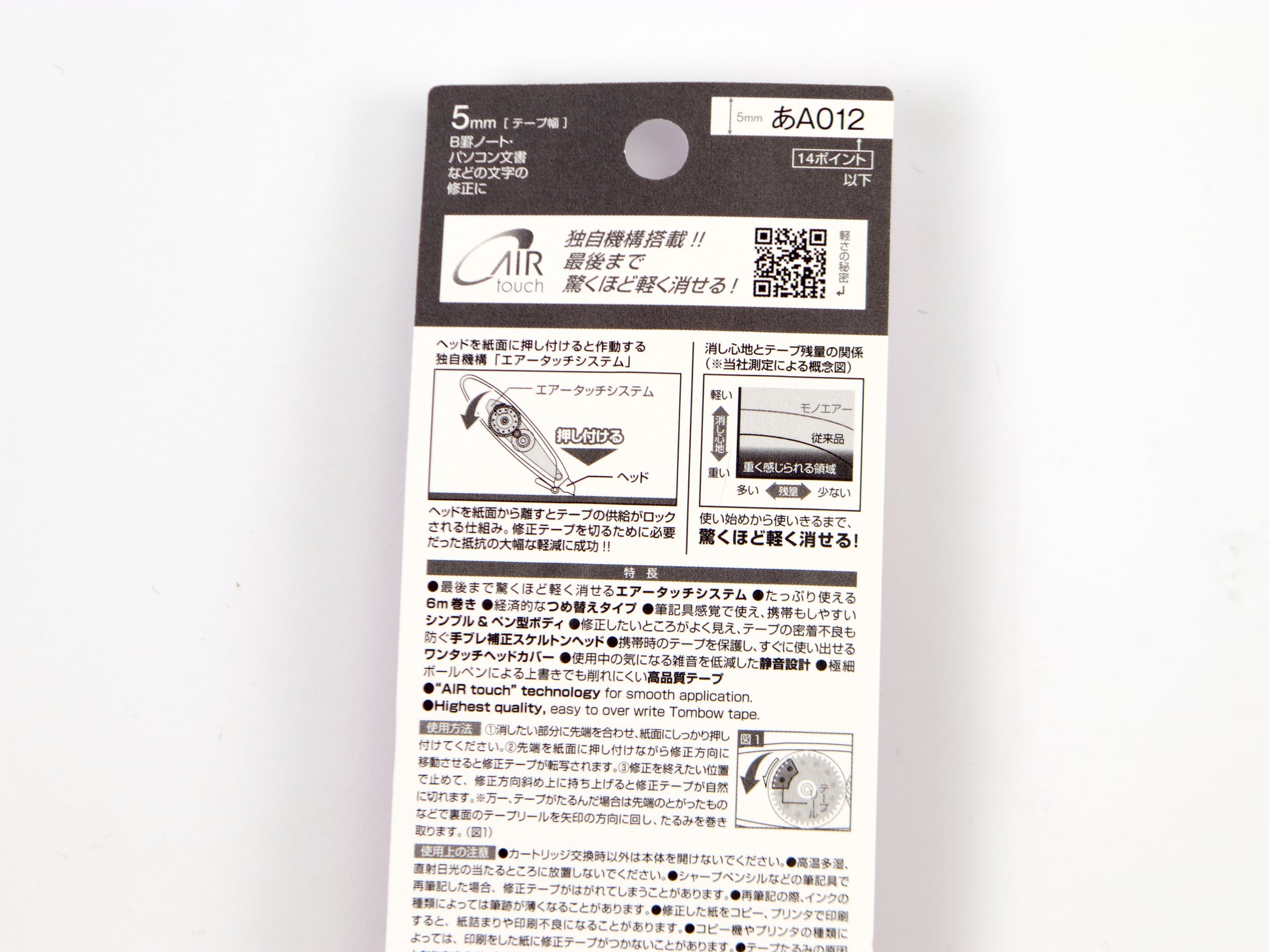 Tombow Mono Air Correction Tape is smooth white 5mm wide correction tape. Airtouch Technology and improved tape adhesion allows users to easily apply correction tape even with the lightest touch. Features a pivoting tape head and unique tape lock system that automatically stops tape and provides smooth, skip-free application. Convenient applicator with protective tip cover.